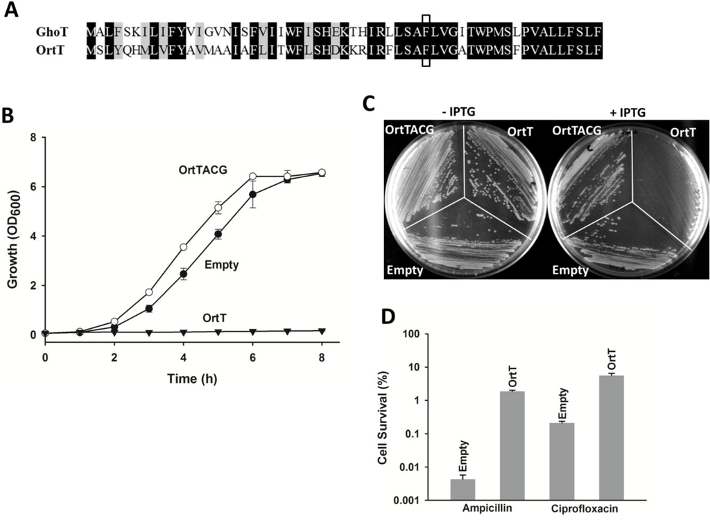 OrtT is a proteic toxin that increases persistence. (A) Sequence homology between GhoT and OrtT is shown, and the conserved Phe38 residue is boxed; (B) Growth of BW25113 wild-type cells harboring different plasmids in LB medium with chloramphenicol (30 µg/mL) with 1 mM IPTG introduced at 1h. Two independent cultures were evaluated. Error bar represent standard deviation; (C) Growth of BW25113 wild-type cells harboring different plasmids on LB plates with chloramphenicol (30 µg/mL) with or without 1 mM IPTG. Two independent cultures were evaluated; (D) Persistence assay with BW25113 wild-type cells after 3 h ampicillin (100 µg/mL) or ciprofloxacin (5 µg/mL) treatment with or without OrtT production. Two independent cultures were evaluated. Error bar represent standard deviation. Plasmid abbreviations: Empty, pCA24N; OrtT, pCA24N-ortT; OrtTACG, pCA24N-ortTACG which lacks a start codon.