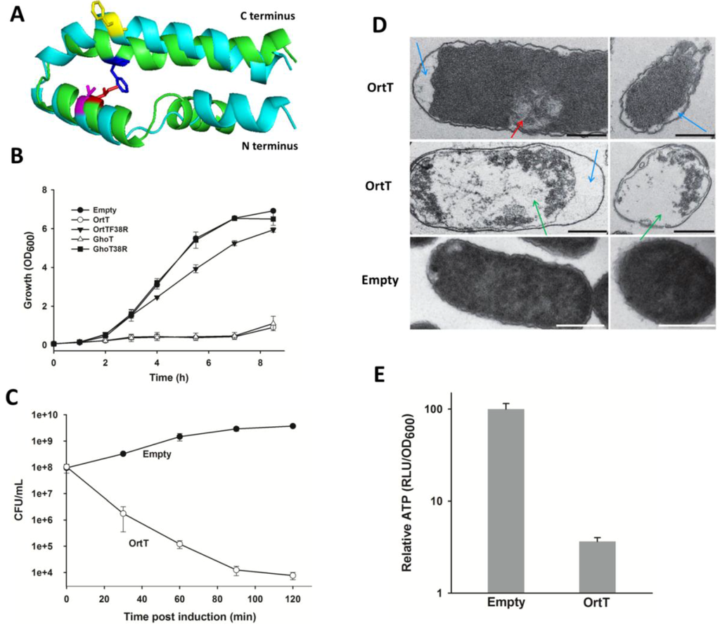 OrtT causes cell lysis via membrane damage and reduces cellular ATP. (A) Superimposed protein model of GhoT (green) and OrtT (cyan). Phe38 is blue for GhoT and yellow for OrtT, and Ile21 is red for GhoT and magenta for OrtT; (B) Growth of BW25113 wild-type cells carrying different plasmids in LB medium with chloramphenicol (30 µg/mL) with 0.1 mM IPTG introduced at 1h. Two independent cultures were evaluated. Error bar represents standard deviation; (C) Cell lysis assay with BW25113 wild-type cells producing OrtT or with empty vector. LB medium was used with chloramphenicol (30 µg/mL) and 2 mM IPTG (added at OD600 0.5). Two independent cultures were evaluated. Error bar represents standard deviation; (D) TEM images of BW25113 wild-type cells producing OrtT (top two rows) or with empty vector (bottom row). Left column shows longitudinal sections, and the right column shows horizontal sections. The blue arrow shows the enlargement of the periplasmic space, the red arrow shows nucleoid condensation, and the green arrow shows the empty cytoplasmic space. Scale bar indicates 0.5 µm; (E) Change in relative intracellular ATP level due to OrtT production in BW25113 wild-type cells. LB medium was used with chloramphenicol (30 µg/mL) and cells were treated with 1 mM IPTG (added at OD600 0.5) for 3 h. The ATP levels were calculated as RLU/OD600 (relative light units/optical cell density at 600 nm) and normalized to that of the strain with the empty vector pCA24N. Plasmid abbreviations: Empty, pCA24N; OrtT, pCA24N-ortT; OrtTF38R, pCA24N-ortTF38R having Phe38 substituted by Arg; GhoT, pCA24N-ghoT; GhoTF38R, pCA24N-ghoTF38R having similar F38R substitution.