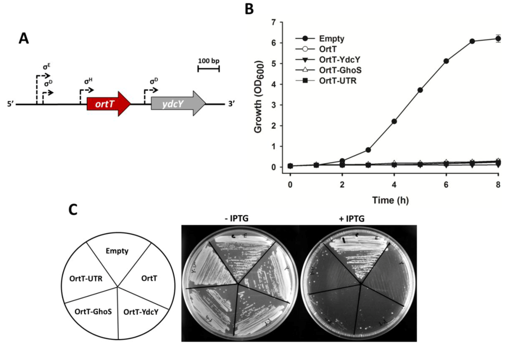 To investigate the mechanism of ortT activation, we tested whether this toxin gene is expressed via the predicted sigma E and H-dependent promoters (Figure 3A) since sigma E (RpoE) is activated by ppGpp [53] and sigma H (RpoH) is under the regulation of sigma E [54]. We activated sigma E via heat-shock stress [55] and qRT-PCR showed that ortT was again activated (Table 1 and Table S1). Therefore, these results demonstrate that OrtT plays a vital role in the adaptive stress response of the cells since ortT is induced under nutrient limiting conditions most likely via transcription factor sigma E and H.