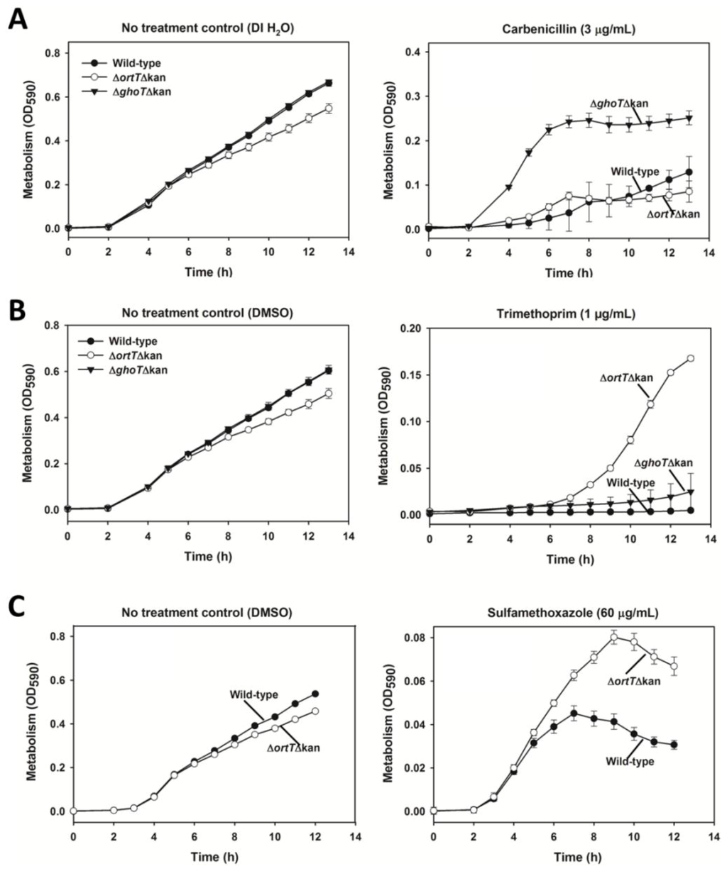 OrtT reduces cellular metabolism under THF-related antimicrobial stress. (A) Metabolic activity of the wild-type, ∆ortT ∆Kan, and ∆ghoT ∆Kan strains in response to 3 µg/mL carbenicillin or water (negative control); (B) Metabolic activity of the wild-type, ∆ortT ∆Kan, and ∆ghoT ∆Kan strains in response to 1 µg/mL TMP or DMSO (negative control); (C) Metabolic activity of the wild-type strain and ∆ortT ∆Kan in response to 60 µg/mL SMZ or DMSO (negative control). Two independent cultures were evaluated for each experiment. Error bar represents standard deviation.