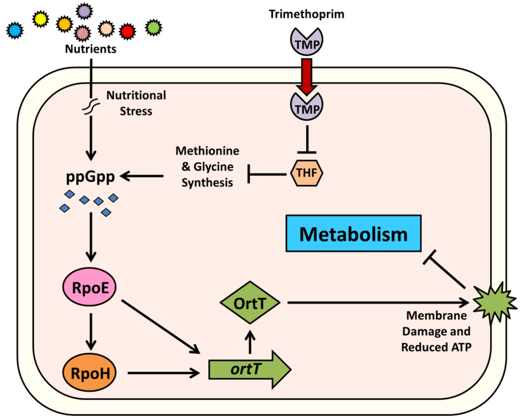 Schematic of proposed mechanism for OrtT-mediated reduction in metabolism under stringent condition. Stringent response or ppGpp accumulation is induced under nutritional stress. TMP treatment also induces ppGpp as reduction in THF level leads to depletion in glycine and methionine. Increased amount of ppGpp then activates the alternative sigma factor RpoE. RpoE in turn activates another stress-related sigma factor RpoH. ortT is under RpoE and RpoH regulation and this way, OrtT is activated to damage cellular membrane and to reduce intracellular ATP level. Thus, activation of OrtT leads to reduction in cellular metabolism during stringent response. The symbol → indicates induction and ⊥ indicates repression.