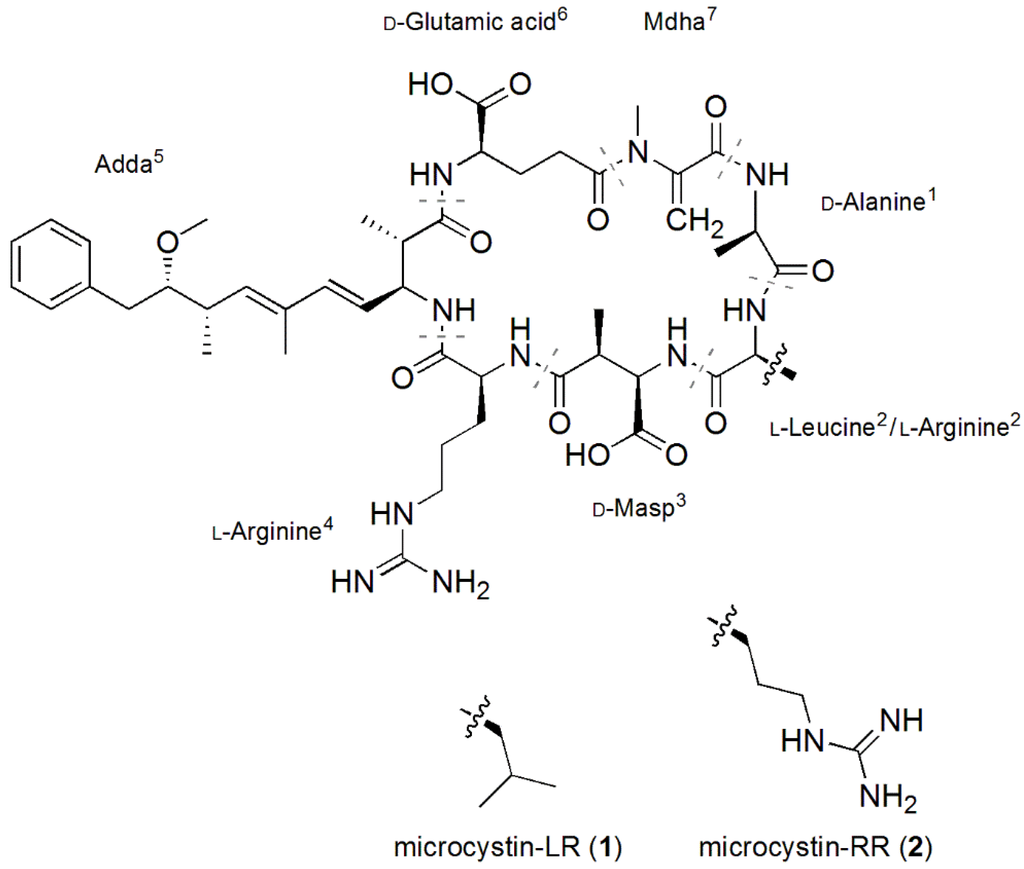 Structures of microcystin-LR (1) and microcystin-RR (2), where Adda is 3-amino-9-methoxy-2,6,8-trimethyl-10-phenyldeca-4,6-dienoic acid, Mdha is N-methyl dehydroalanine and Masp is methylaspartic acid.