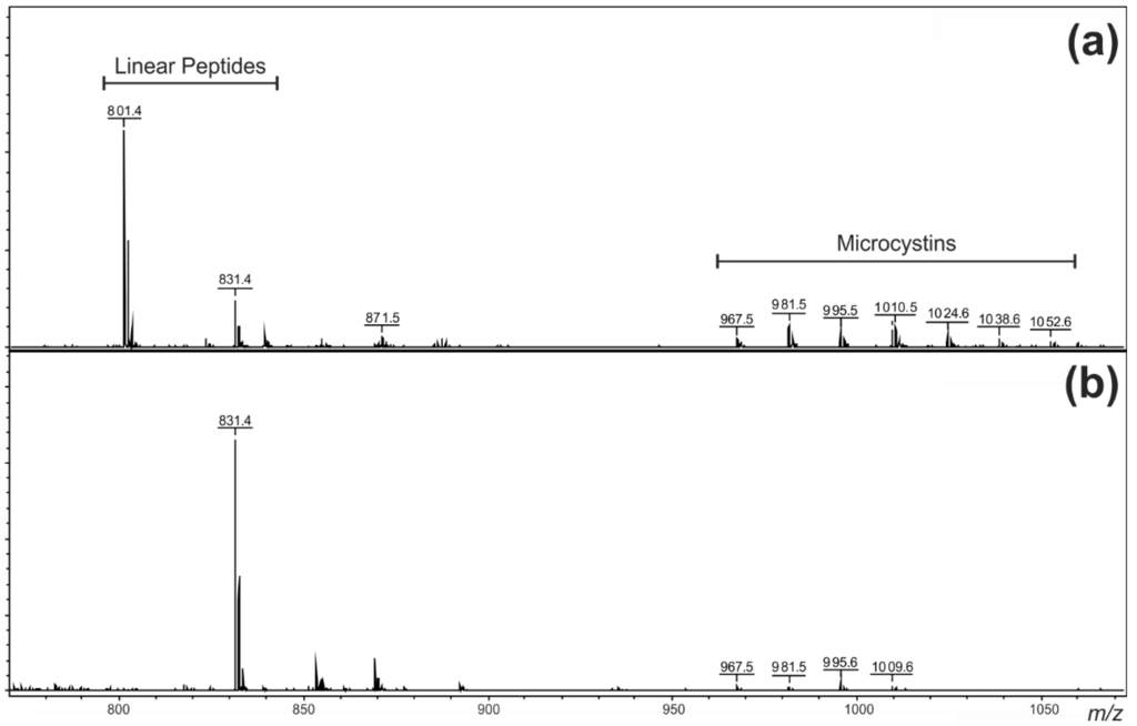 - Erhard, M.; von Döhren, H.; Jungblut, P.R. Rapid identification of the new anabaenopeptin G from Planktothrix agardhii HUB 011 using matrix-assisted laser desorption/ionization time-of-flight mass spectrometry. Rapid Commun. Mass Spectrom. 1999, 13, 337–343. [Google Scholar] [CrossRef] [PubMed]