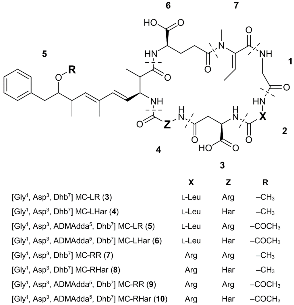Structures of the eight Antarctic microcystin (MC) congeners (3–10) identified from two Miers Valley (Antarctica) samples; Arg, arginine; Dhb, dehydrobutyrine; Gly, glycine; Har, homoarginine; Leu, Leucine.