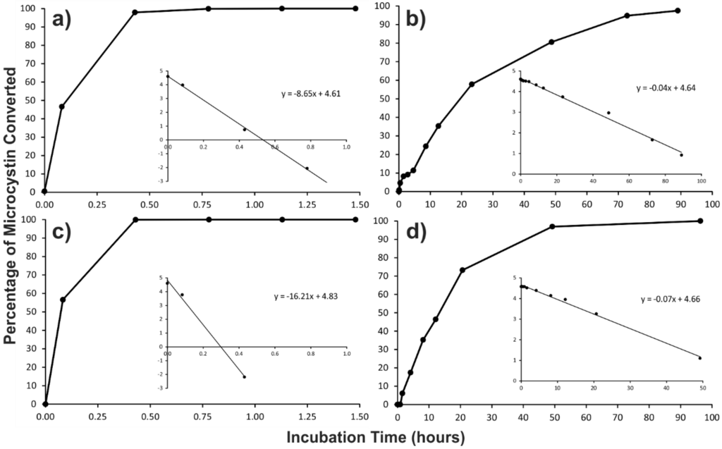 Time courses and first-order rate plots (inset) for the β-mercaptoethanol derivatization (at 30 °C; pH 9.7) of: (a) MC-LR; (b) the Antarctic-LR congeners identified in two Miers Valley (Antarctica) samples; (c) MC-RR; and (d) the Antarctic-RR congeners identified in two Miers Valley samples.