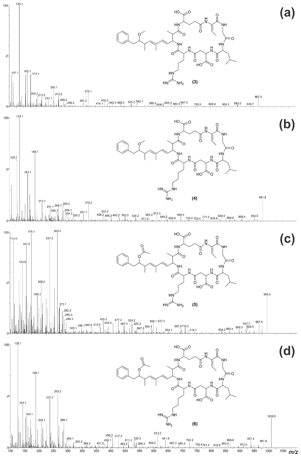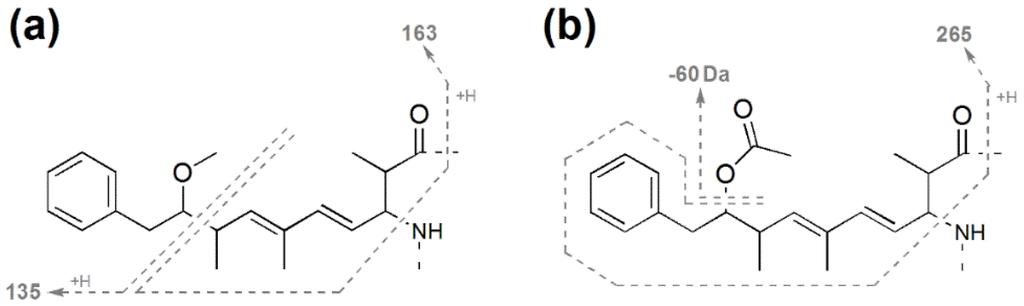 The Adda portion of the microcystin structure fragments under electrospray ionization collision-induced dissociation (ESI CID) conditions to form diagnostic ions (m/z 135 and 163; Figure 5a) commonly used for the identification and characterization of microcystins [30,31]. Microcystins containing the ADMAdda modification form different fragment ions under ESI CID conditions (m/z 60 and 265; Figure 5b) as the O-acetyl group dissociates from the main structure more readily [32].