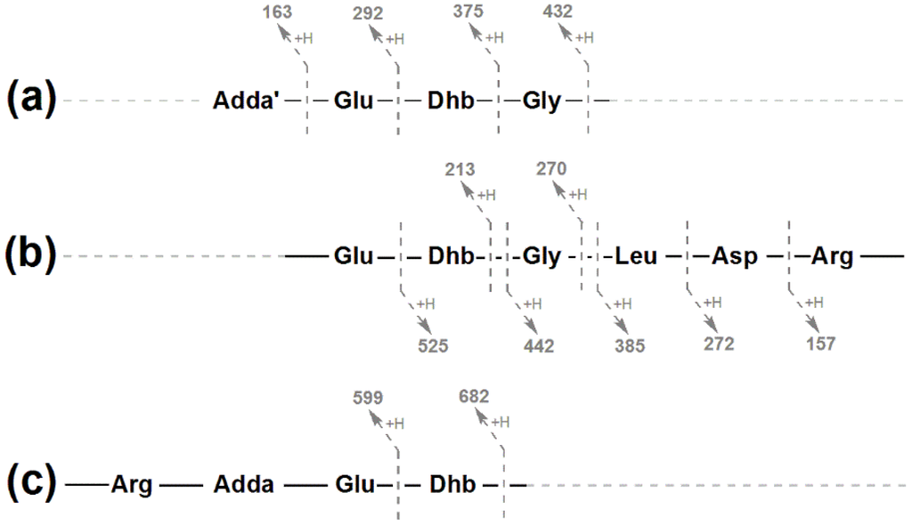 Tandem mass spectrometry fragment ions yielding three amino acid sub-sequences (a–c) which indicate the full amino acid sequence for [Gly1, Asp3, Dhb7] MC-LR (3).