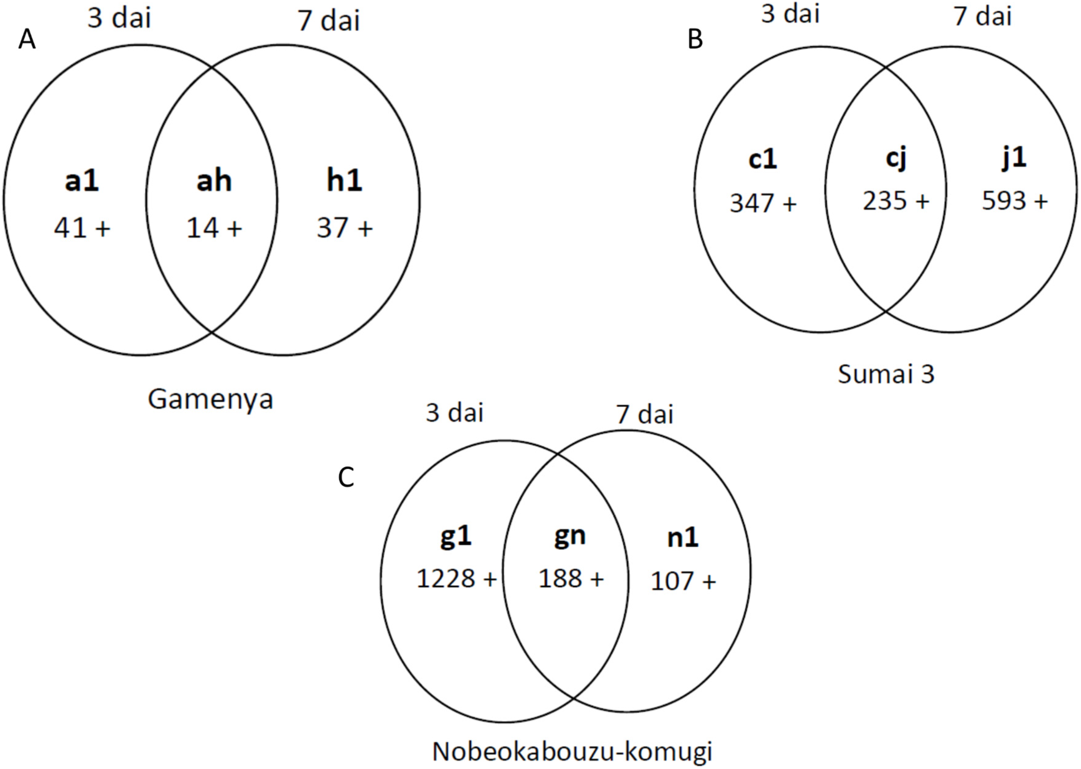 Figure 5. Number of wheat differentially expressed genes in individual genotypes. (A) Gamenya at 3 dai (a1), 7 dai (h1) and both time points (ah); (B) Sumai 3 at 3 dai (c1), 7 dai (j1) and both time points (cj); (C) Nobeokabouzu at 3 dai (g1), 7 dai (n1) and both time points (gn).