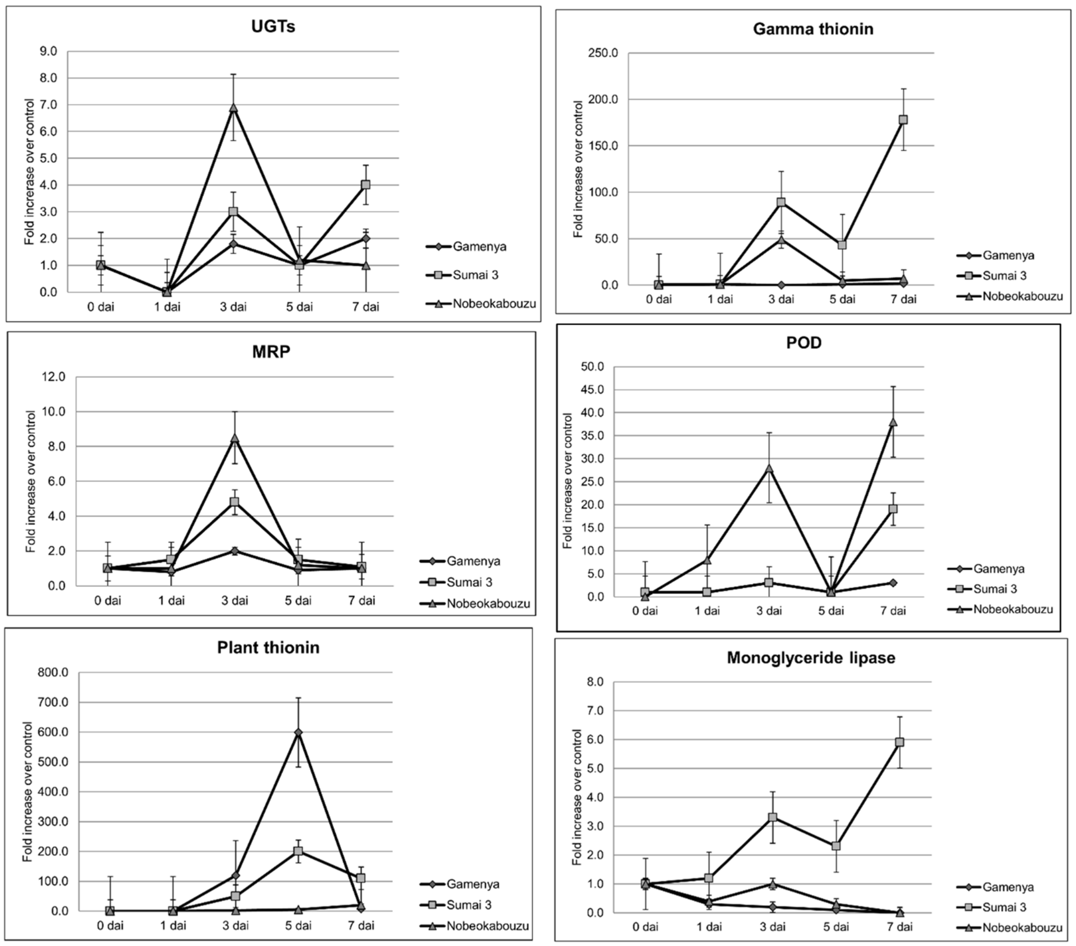 Figure 6. Confirmation of the expression of selected genes in three wheat genotypes by real-time PCR. The expression of each gene is defined as the fold change normalized to the reference gene, GADPH, and relative to the mock-treated control sample. UGTs, UDP-glucosyltransferase; MRP, multidrug-resistant protein; POD, peroxidase; dai, days after inoculation; Nobeoka, Nobeokabouzu-komugi. As shown in Table 1, the gene IDs are: UGT, 15510; MRP, 8976; plant thionin, 23363; gamma thionin, 8436; peroxidase, 19329; monoglyceride lipase, 7118.