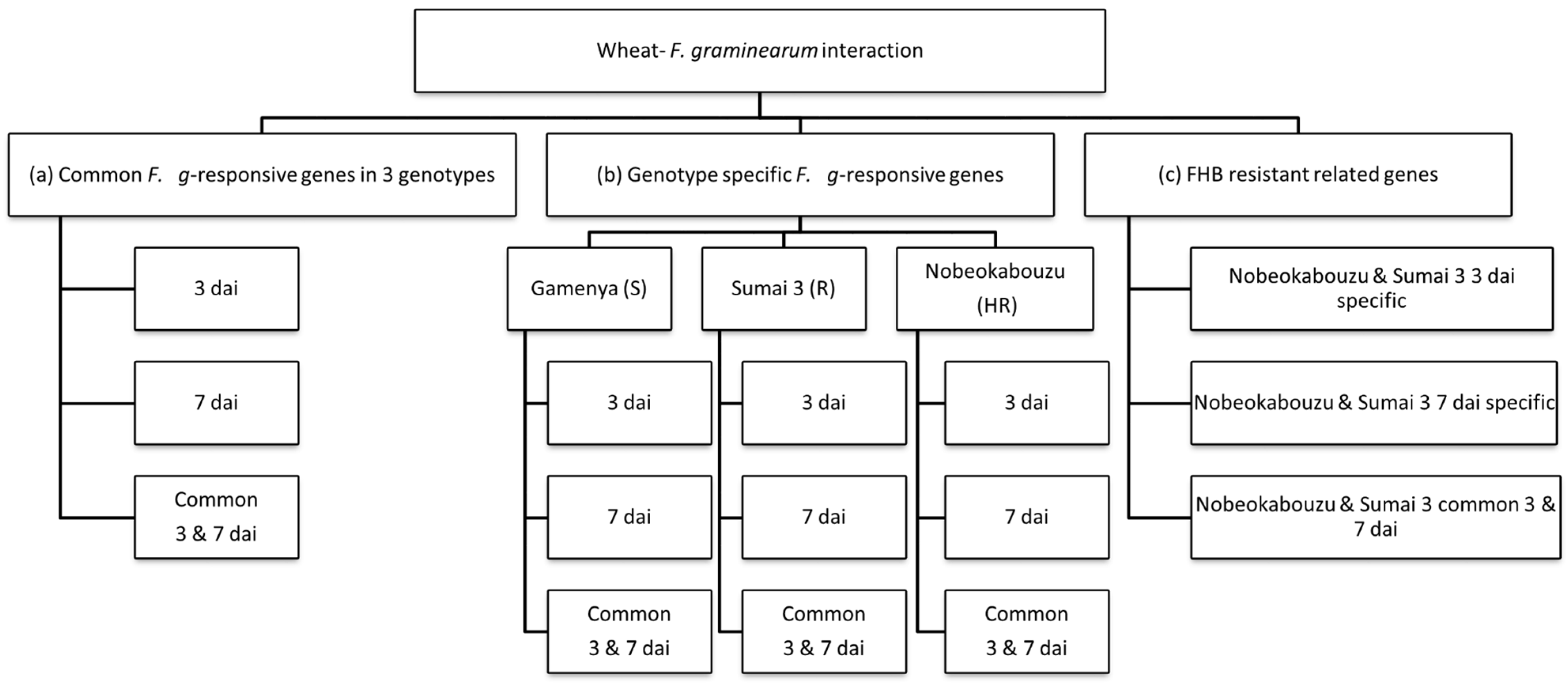 Figure 7. Flow chart of the data analysis. The expression of F. graminearum-responsive wheat genes was classified as: (a) common F. graminearum-responsive genes in wheat genotypes by comparative selection at 3 and 7 dai; (b) genotype-specific F. graminearum-responsive genes for susceptible, resistant and highly resistant wheat genotypes at 3 and 7 dai; and (c) FHB resistance-related genes at 3 and 7 dai. S, R and HR denote the susceptible, resistant and highly resistant cultivars, respectively.