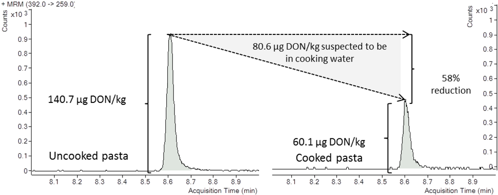 Selected reaction monitoring (SRM) chromatograms of the naturally deoxynivalenol (DON) contaminated pasta before and after culinary treatment at 140.7 µg/kg and 60.1 µg/kg, respectively, on a dry weight basis, and percentage of mycotoxin reduction.