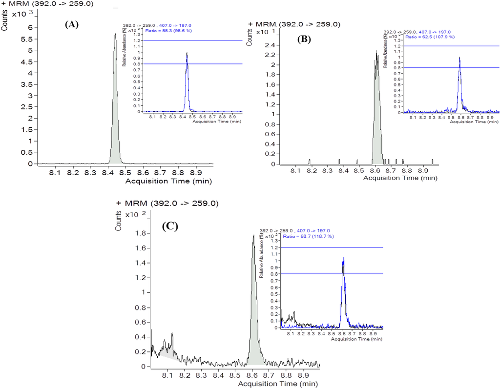 (a) SRM chromatograms of the naturally contaminated composite; (b) wheat-beer and (c) urine by deoxynivalenol at 122.6 µg/kg, 37.2 µg/kg and 20.8 µg/L, respectively.