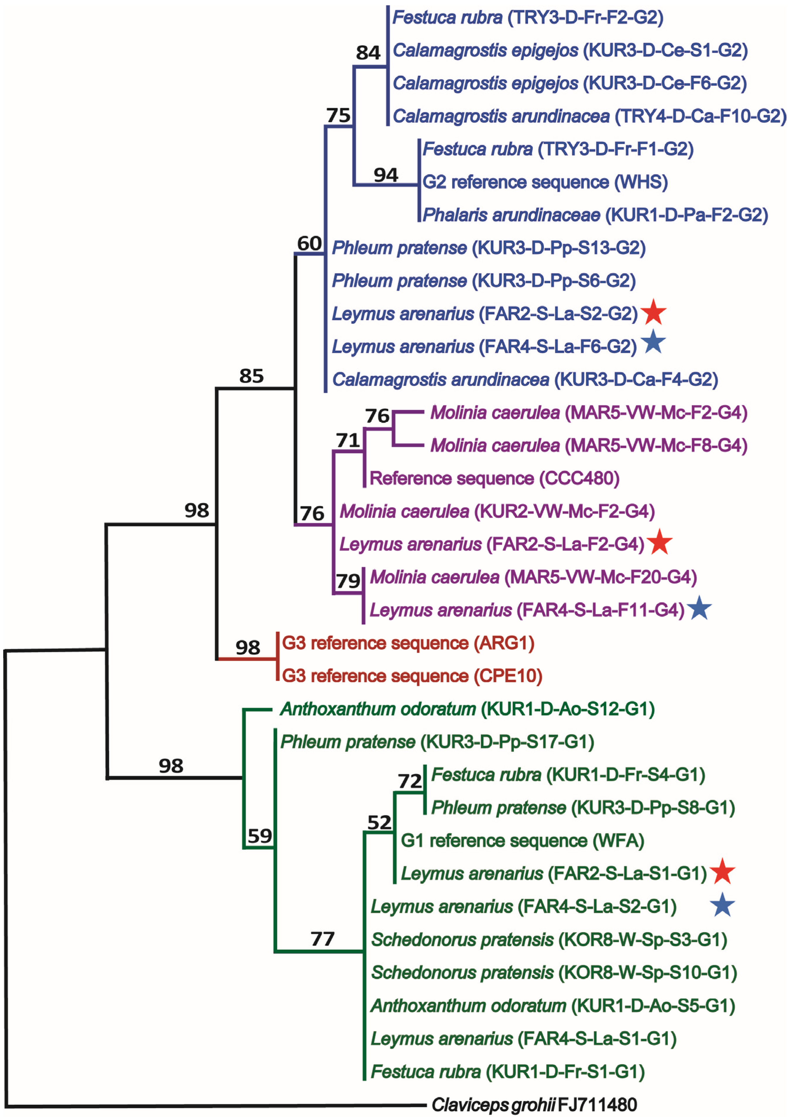 One out of two most parsimonious trees (maximum parsimony, unweighted; length = 59) of the C. purpurea sensu lato species complex constructed from combined alignments of representative internal transcribed spacer region (ITS) and β-tubulin (tubB) DNA sequences. Four major groups (G1 (green), G2 (blue), G3 (red) and G4 (purple)) are identified although the separation of G2 and G4 had less bootstrap support (1000 replicates; number above branches). In the tree, included sequences of this study are denoted with original host of the Claviceps sclerotium designated by a sequence ID (in parentheses) encoded as follows: Locality (FAR = Farsund; KOR = Korsvoll; KUR = Kurdøla; MAR = Maridalen; TRY = Tryvann), plot # (1–8) within each location, habitat (D = dry, W = wet, VW = very wet, S = saline), host (Ao = Anthoxanthum odoratum, Ca = Calamagrostis arundinacea, Ce = Calamagrostis epigejos, Fr = Festuca rubra, La = Leymus arenarius, Mc = Molinia caerula, Pa = Phalaris arundinacea, Pp = Phleum pretense, Sp = Schedonorus pratensis), floating ability (F = floating, S = sinking), sclerotia # within the sample, and the genetic group (G1–G4). Stars indicate co-occurrence of three genetic groups within the same plot on the same host over two seasons (2011 = red star, 2012 = blue star). The sequences have been submitted to EMBL/GenBank under the following accession numbers: ITS (LN736206–LN736233), tubB: (LN736234–LN736261). Reference sequences from Claviceps grohii CBS isolate 124.47 (ITS: AJ133395 tubB: FJ711480) were included as outgroups to root the tree. Reference sequences from C. purpurea sensu lato retrieved from EMBL include G2 reference WHS (ITS: EU559018, tubB: EU558997), CCC480, recently described as C. arundinis which grouped with our G4 isolates (ITS: EU344983, tubB: JX083420), G3 reference ARG1 (ITS: JX083542, tubB: JX083473), G3 reference CPE10 (ITS: EU559007, tubB: EU558986) and G1 reference WFA (ITS: EU559017, tubB: EU558996).