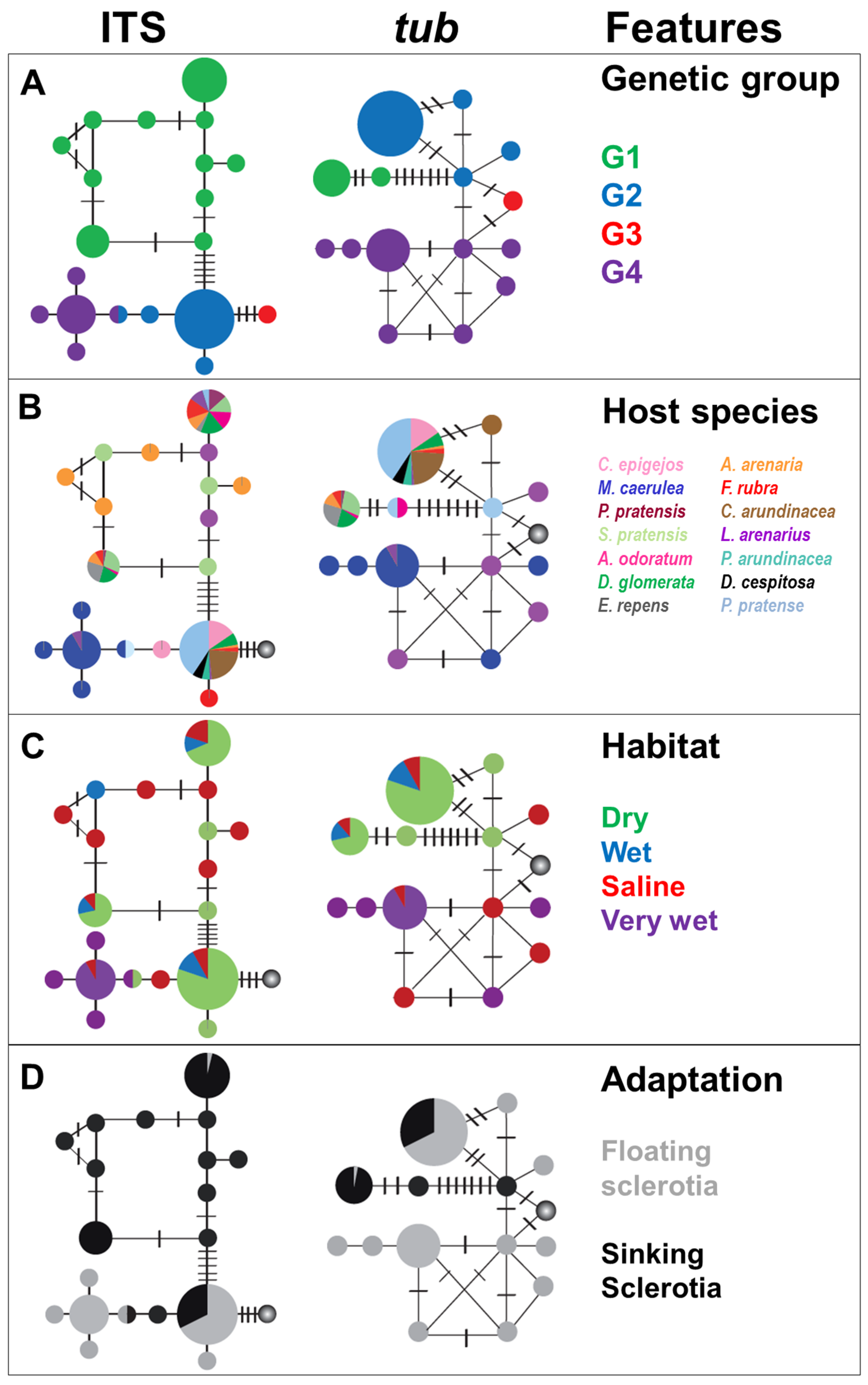 Haplotype networks of unique ITS (left) and tubB (right) sequences of the C. purpurea sensu lato. Each circle represents one haplotype and there is one mutational step between each circle and short crossing line (representing hypothetical haplotypes). Circle size reflects the haplotype abundance ranging from approximately N = 1 to N = 350. In the different panels, the following information (features) is superimposed: (A) genetic groups inferred from the phylogenetic analysis (cf. Figure 1), (B) host plant, (C) habitat, and (D) adaptation in terms of floating ability of the sclerotia. The circle representing G3 is shaded with a grey gradient in panels B–D to indicate lack of data.