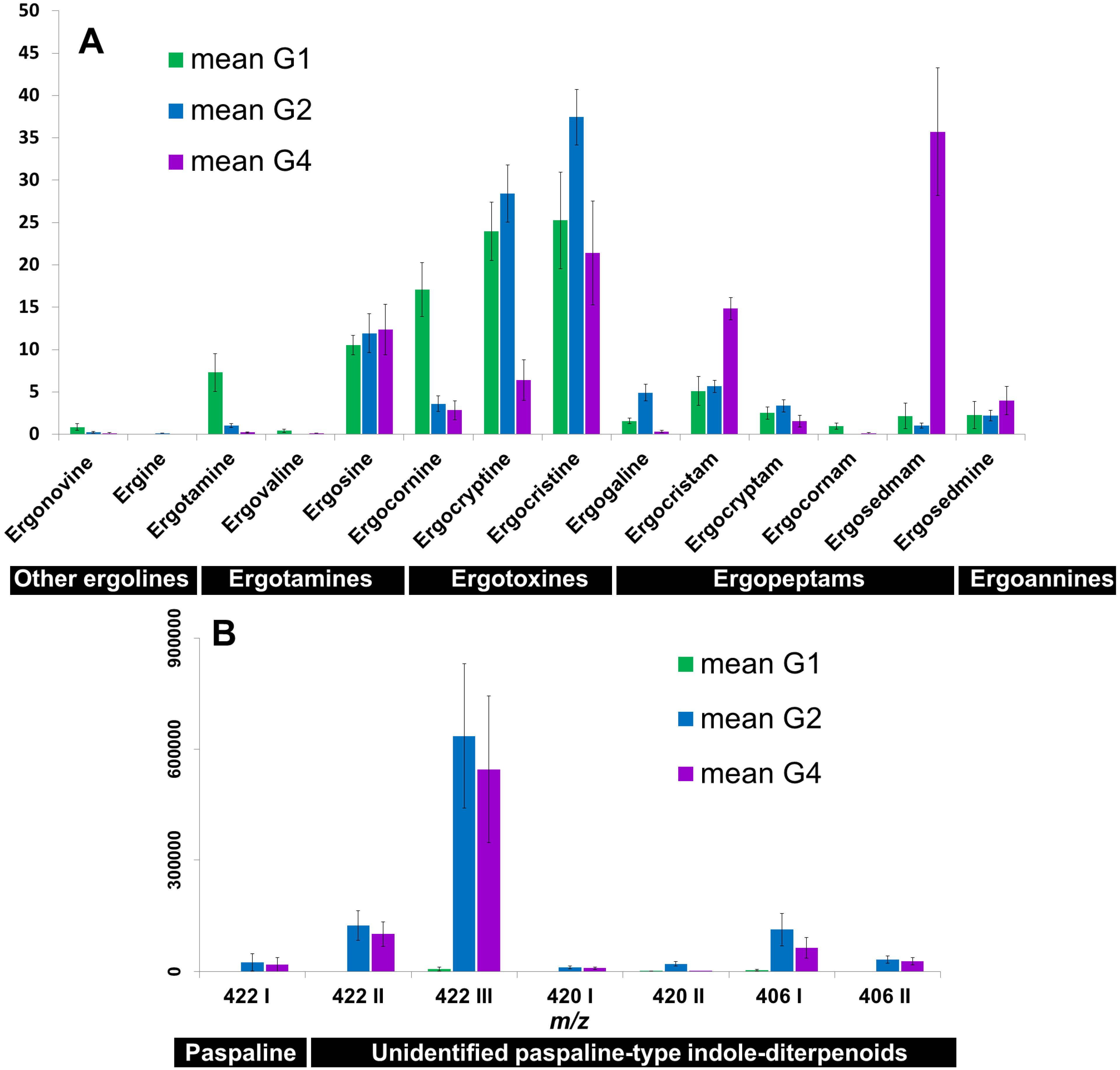 Histograms showing relative concentrations of ergot alkaloids (sum of 8-R and 8-S epimers) (A) and indole-diterpenes (B) in the three examined genetic groups of C. purpurea sensu lato of this study (G1, G2 and G4). Chemical structures of most C. purpurea sensu lato indole-diterpenes are not yet determined, and designations are thus according to the m/z ratio of their protonated molecular ions and their elution order. For an overview over chemical structures see Figure S1 and [29,30].
