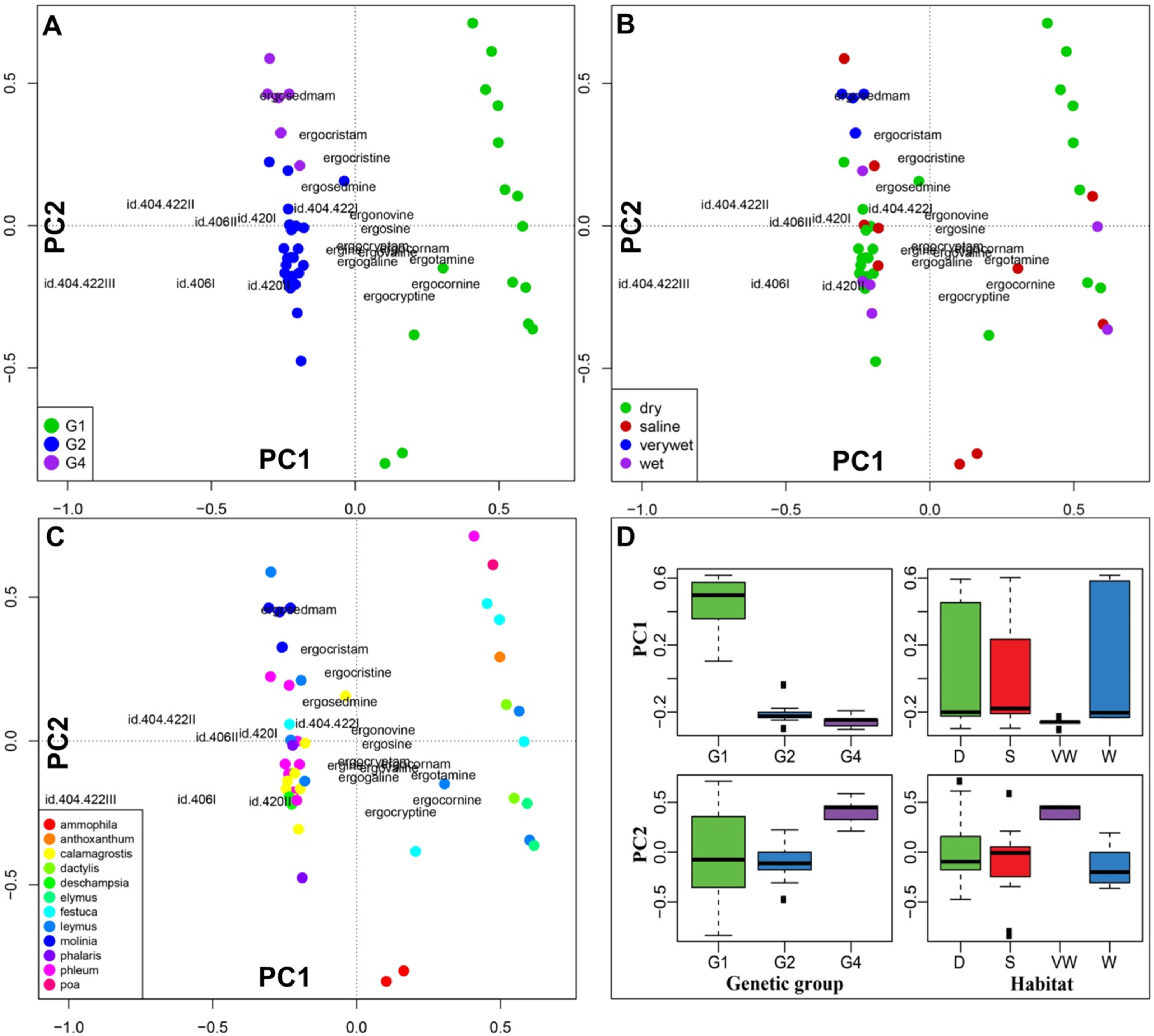 Principal component analysis (PCA) of fourth root transformed indole-alkaloid profiles shown as biplots with sample scores as dots and indole-alkaloid loadings as text labels. The sample score colours are coded according to (A) genetic group, (B) habitat, and (C) host plant genus. Box-plots (D) compare the first and second principal components for scoring of the genetic groups and habitat (D = dry, S = saline, VW = very wet and W = wet) illustrating that the first PC divides G1 from G2/G4 and the second PC separates G2 from G4. Note: Schedonorus pratensis (= Lolium pratense = Festuca pratensis) was treated as Festuca.