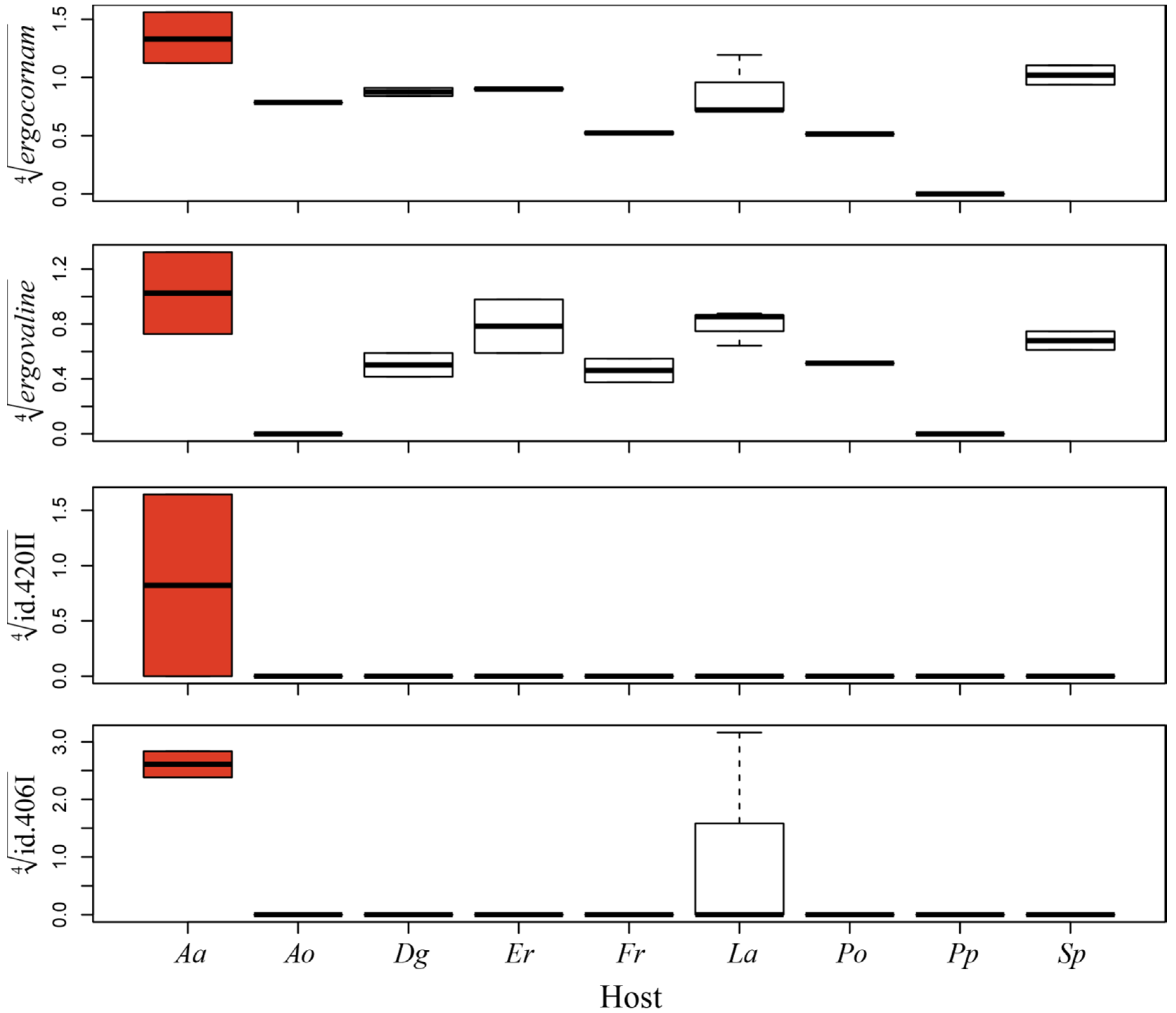 Unique indole-alkaloid composition in G1 sclerotia of Ammophila arenaria. The box-plots (fourth root transformed relative indole-alkaloid concentrations) show the four indole alkaloids where G1 sclerotia of A. arenaria produce significantly (red boxes) higher quantities compared to G1 sclerotia of host plant species. Host abbreviations: Aa = Ammophila arenaria Ao = Anthoxanthum odoratum, Dg = Dactylis glomerata, Er = Elymus repens, Fr = Festuca rubra, La = Leymus arenarius, Po = Poa pratensis, Pp = Phleum pretense, Sp = Schedonorus pratensis.