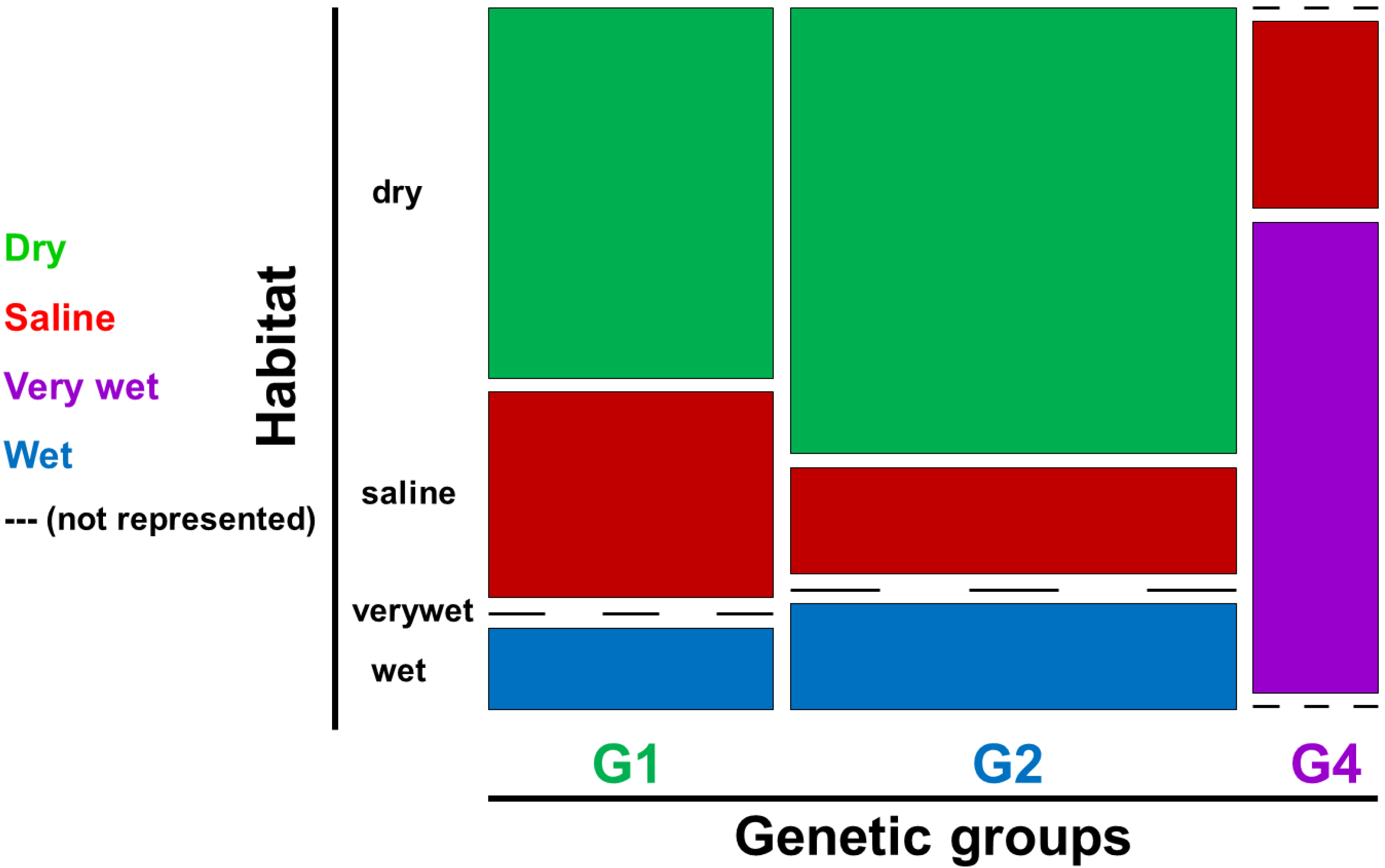 Mosaic plot of habitat distribution across the genetic groups, where G1 and G2 both were found in dry, wet and saline habitats in Norway. In contrast, the genetic group G4 was the only group with high prevalence in very wet habitats. G4 was infrequently found also in saline habitats.