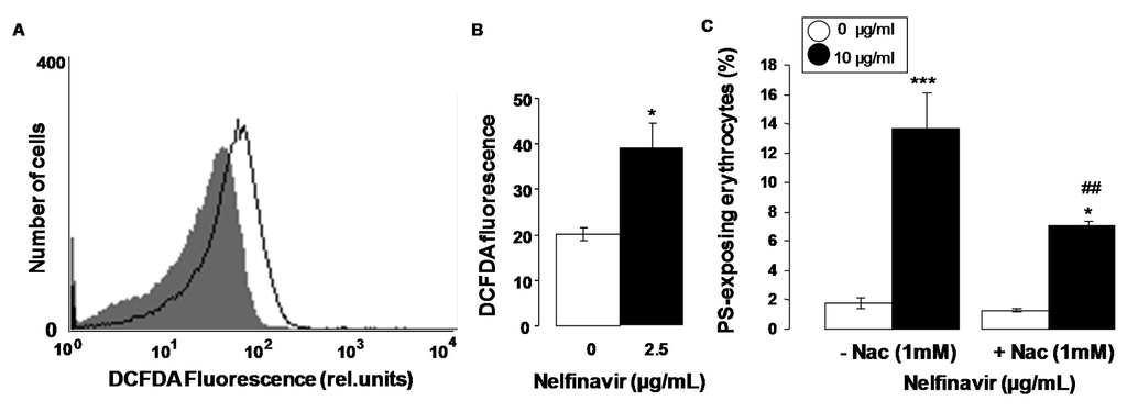 Effect of nelfinavir on reactive oxygen species. (A) Original histogram of 2',7'-dichlorodihydrofluorescein diacetate (DCFDA) fluorescence in erythrocytes following exposure for 48 h to Ringer solution without (grey shadow) and with (black line) presence of 10 µg/mL nelfinavir; (B) Arithmetic means ± SEM (n = 5) of the erythrocyte DCFDA fluorescence following incubation for 48 h to Ringer solution without (white bar) or with (black bar) presence of 10 µg/mL nelfinavir. * (p<0.05) indicates significant difference from the absence of nelfinavir (t test); (C) Arithmetic means ± SEM (n = 6) of annexin-V-binding of erythrocytes after a 48 h treatment with Ringer solution without (white bars) or with (black bars) 10 µg/mL nelfinavir in the absence (left bars, −Nac) and presence (right bars, +Nac) of the antioxidant N-acetylcysteine (1 mM). * (p < 0.05), *** (p < 0.001) indicate significant difference from the absence of nelfinavir, ## (p < 0.01) indicates significant difference from the respective value in the absence of the antioxidant N-acetylcysteine (1 mM).