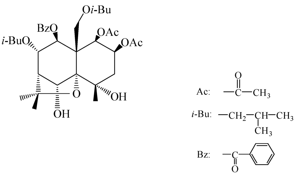 The disadvantages of synthetic pesticides, such as acute and chronic poisoning in humans, destruction of non-target organisms, environment contamination, and the evolution of resistance to pesticides in pest populations, have become more evident because of their increasing use [1]. By contrast, botanical pesticides have been receiving considerable attention because of their desirable properties of effectiveness, safety and ecological acceptability [2]. In addition to the outstanding and well-known bioactive compounds (pyrethrum, rotenone and nicotine), studies on bioactive compounds from other plants are increasing, such as species of the Annonaceae [3], the Meliaceae [4,5], the Celastraceae [6,7] and the Rutaceae [8,9], have been widely available. Moreover, the number of papers published annually on botanical pesticides increased from 61 in 1980 to 1207 in 2012 [10].