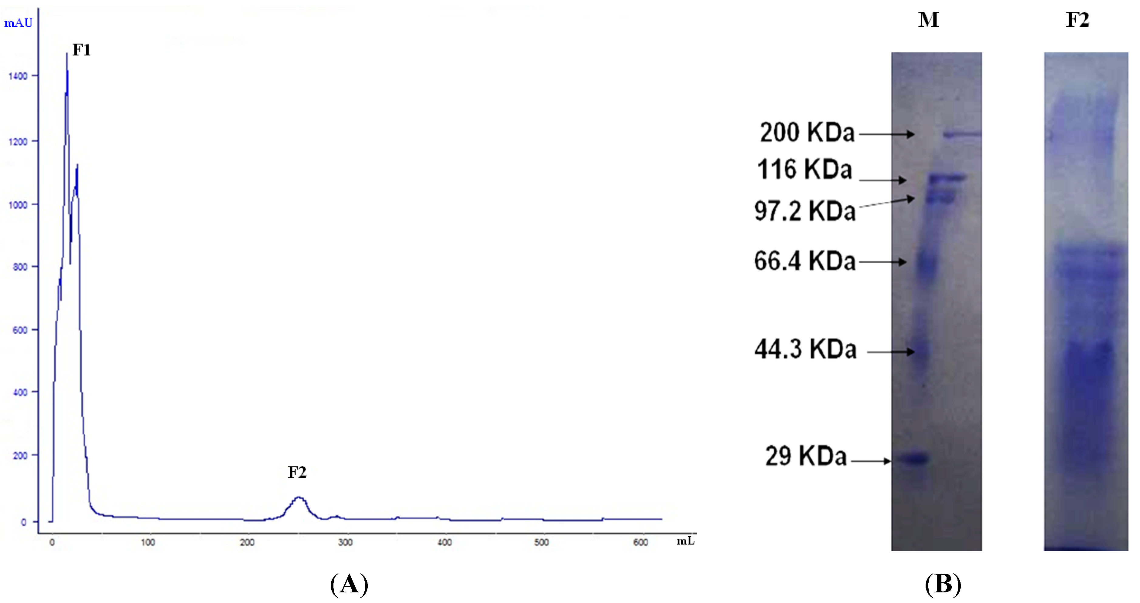 Affinity chromatography using Celangulin V-Sepharose of BBMV proteins extracts from M. separata larvae. (A) F1 is the unbound protein eluted with binding buffer; F2 is eluted with Celangulin V dissolved in binding buffer; (B) 12% SDS-PAGE of fraction M: protein marker; F2: Fraction 2.