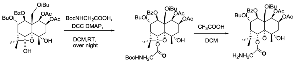 Eighty-two milligrams (0.1 mmol) of Celangulin V-6-Boc aminoacetic acid ester obtained from the last step was dissolved in 10 mL of anhydrous methylene chloride. After adding trifluoroacetic acid (0.2 mL, 1.75 mmol), the mixture was stirred overnight at room temperature. The reaction was checked with TLC, and when it was completed, 1 mL of saturated sodium bicarbonate solution was added to quench the reaction. Twenty milliliters of water was added to the mixture which was then extracted with ethyl acetate (30 mL × 3). Ethyl acetate layers were combined and washed with water and saturated sodium chloride, dried over anhydrous sodium sulfate and separated by column chromatography (silica gel, 200 ~ 300 mesh) with a gradient of petroleum ether (60–90 °C) and ethyl acetate as eluent to yield a compound of 76 mg of Celangulin V-6-aminoacetic acid ester. The structure was characterized by 1H-NMR, 13C-NMR, DEPT and MS.