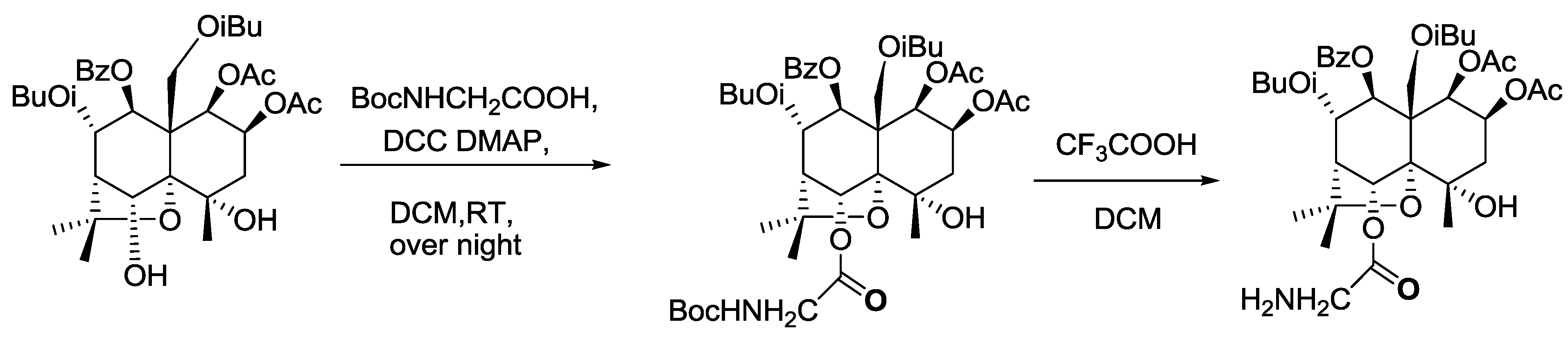 One hundred milligrams of Celangulin-V (0.15 mmol) was dissolved in 10 mL of anhydrous methylene chloride, and Boc-protected amino acetic acid (32 mg, 0.18 mmol), N,N'-dicyclohexylcarbodiimide (DCC, 62 mg, 0.30 mmol), and 4-dimethylaminopyridine (DMAP) (5 mg, 0.04 mmol) were then added. The mixture was stirred over night at room temperature. When the reaction was completed (checked by TLC), 1 mL of methanol was added to quench the reaction. After filtration, 40 mL of water was added to the mixture which was then extracted with ethyl acetate (30 mL × 3). Ethyl acetate layers were combined and washed with water and saturated sodium chloride, dried over anhydrous sodium sulfate and separated by column chromatography(silica gel, 200~300 mesh) with a gradient of petroleum ether (60–90 °C) and ethyl acetate as eluent to yield a compound of 76 mg of Celangulin V-6-Boc aminoacetic acid ester. The structure of the compound was characterized by 1H-NMR, 13C-NMR, DEPT and MS.
