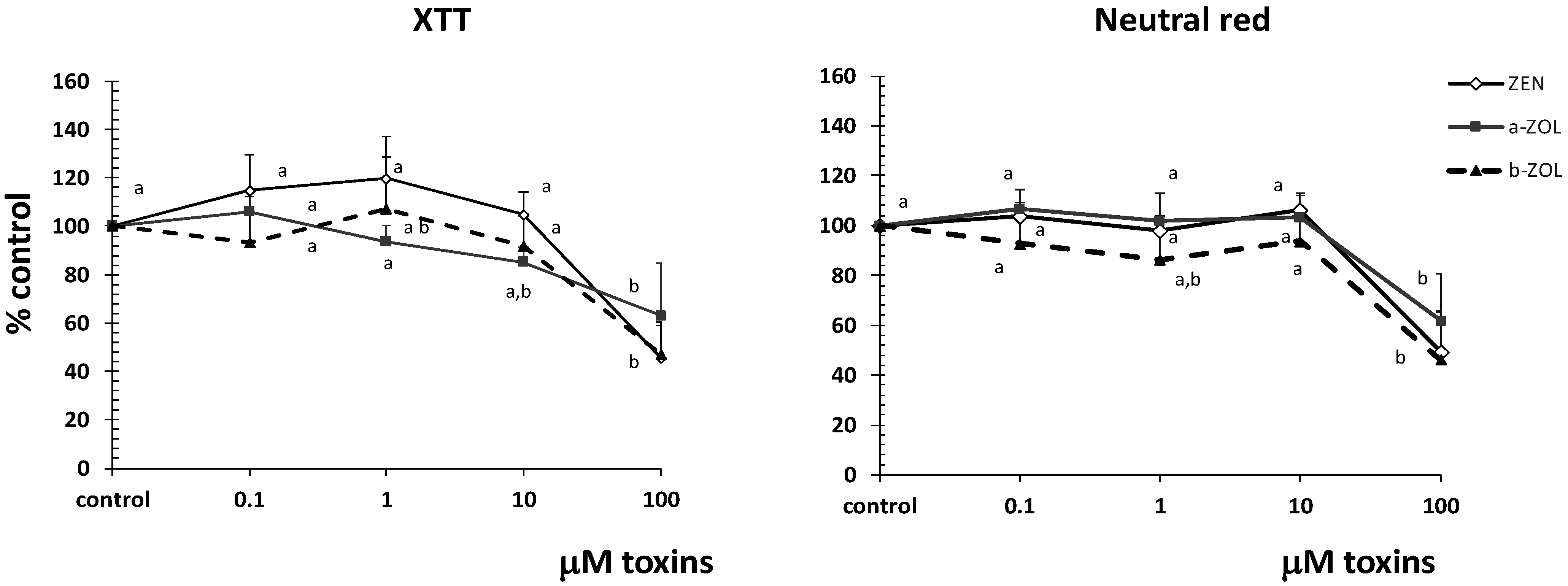 Effect of zearalenone and its metabolites on the IPEC-1 cells viability. The ability of IPEC cells to proliferate was measured using XTT and NR assays. Data are expressed as mean ± SEM from four independent experiments. Two way ANOVA tests were performed to determine the effect of toxin treatment. a,b indicate significant differences (p < 0.05) between control and different concentrations of ZEN and its metabolites.