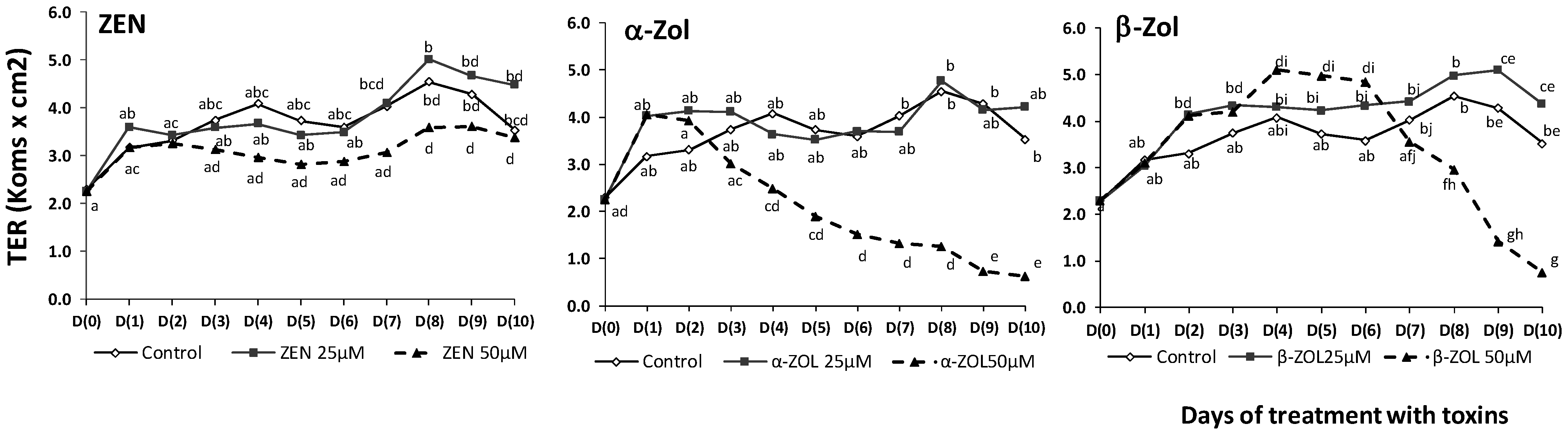 Effect of ZEN and its metabolites on transepithelial electrical resistance (TER) in IPEC-1 cells. Cells were grown and differentiated on inserts. At day 0, 25 and 50 µM ZEN and metabolites were added in the apical compartment, and TER was measured. TER values are expressed in kΩ × cm2 as mean ± SEM of four independent experiments. Two way ANOVA tests were performed to determine the effect of toxin treatment. a–g indicate significant differences (p < 0.05) between control and different concentrations of toxins.