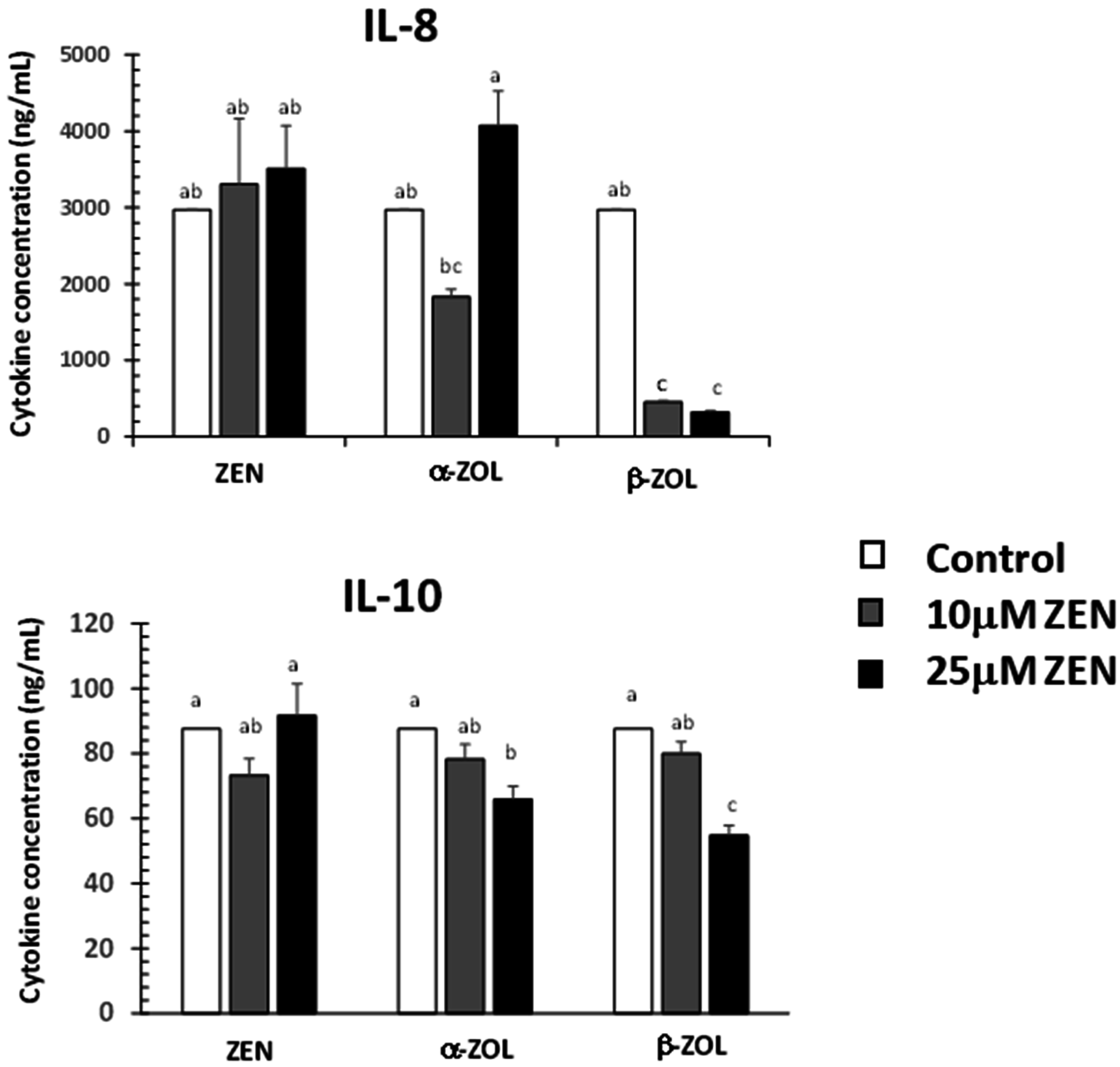 Our results showed no effect of ZEN on IL-8 and IL-10 synthesis. Other studies showed that ZEN can increase the expression of toll like receptors and of certain cytokines involved in inflammation or responsible for the recruitment of immune cells [30]. By contrast, α- and β-ZOL decreased the expression of both IL-8 and IL-10 in a dose dependent manner, and, with the exception of IL-8, there was no effect produced by 10 µM of α-ZOL. Among ZEN metabolites, β-ZOL was the most toxic, inducing a decrease of the IL-8 synthesis by 84.8% at the dose of 10 µM and by 89.1% at the dose of 25 µM. In a similar way, β-ZOL induced a decrease of IL-10 synthesis by 8.8% and 37.5% at the dose of 10 µM and 25 µM, respectively. For 50 µM, the cytokine concentration was below the limit of detection (data not shown).