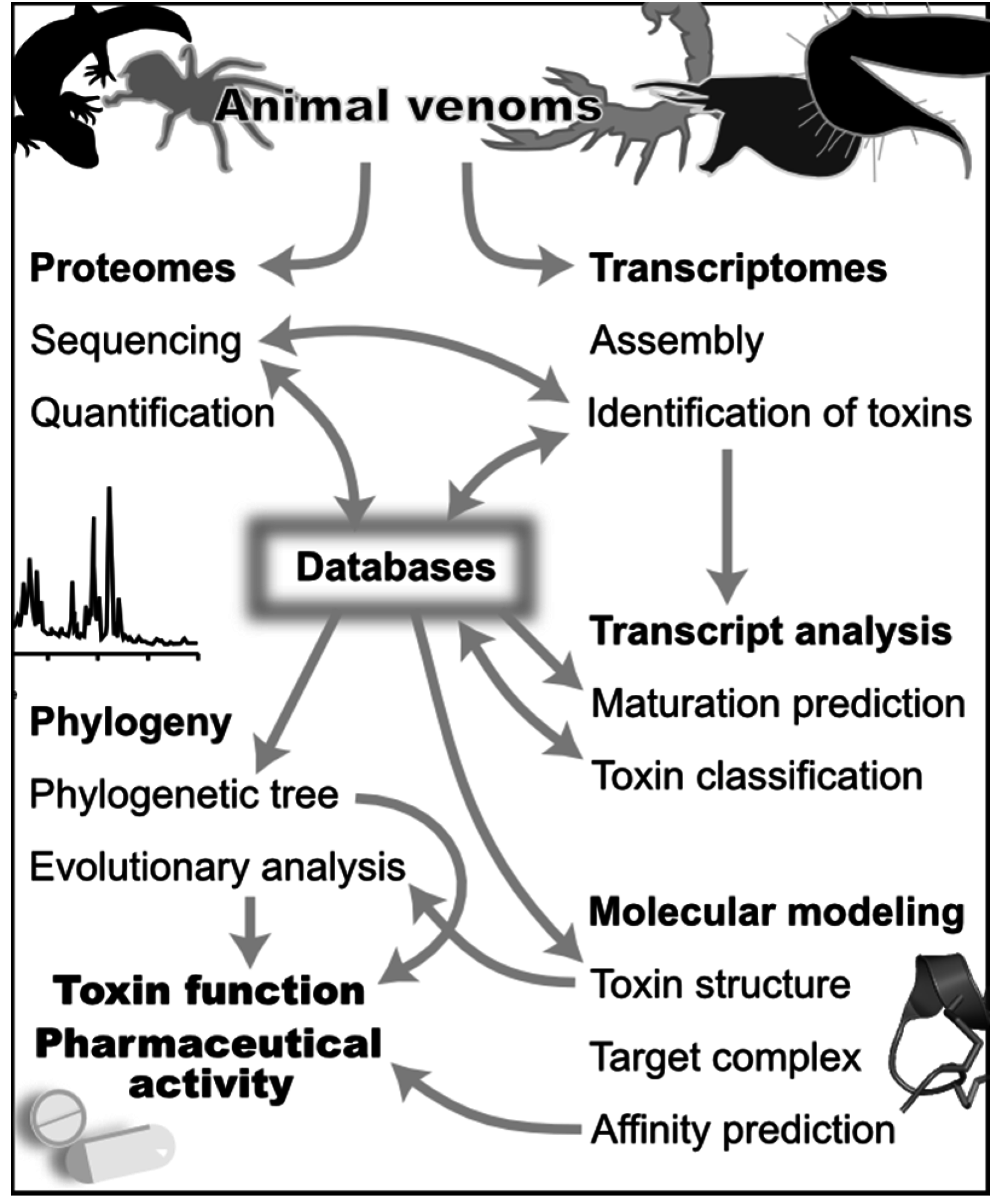 Computational approaches in venomics. The different themes in this figure are discussed in the text. Generalist and specialized databases are a central source of information for both the discovery (top) and analysis (bottom) of venoms. Venomics computational tools combine data from proteomics and transcriptomics to discover the set of toxins in a venom gland. These tools use predictions of mature toxins from transcriptomes to support peptide sequencing, and sequencing by mass spectrometry uses transcript sequences as a database to rapidly identify peptides and their post-translational modifications. Bioinformatics tools use the standardized classification stored in databases to analyze transcripts, and phylogenetic analyses can be used to analyze toxin evolutionary relationships. Databases in turn record the newly identified toxin peptide and transcript sequences. These sequence data can be also used to refine toxin classification, for example when a new phylogenetic group of toxins is identified. The molecular target of toxins can be suggested by a phylogeny and an evolutionary analysis complemented by the prediction of toxin 3D structures. Molecular modeling of target/toxin complexes can be used to analyze in great depth structure-activity relationships of toxins. Finally, the affinity of these complexes can be predicted from the molecular models.
