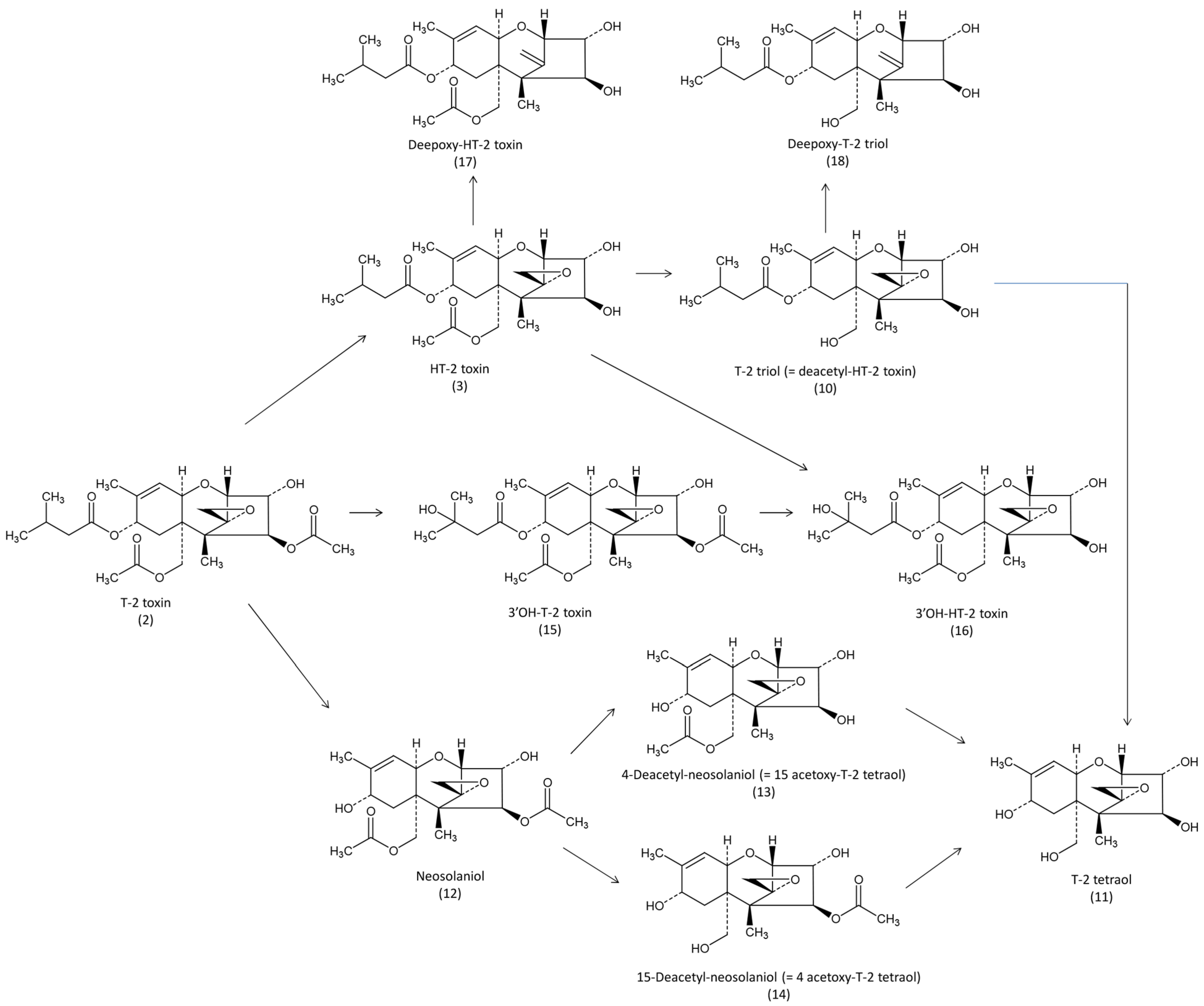 40]. It is not known whether 3′-OH-T-2 is formed after deacetylation of T-2 toxin or after its hydroxylation, and whether T-2 tetraol is formed after deacetylation of 4-deacetyl-neosolaniol and 15-deacetyl-neosolaniol or dealkylation of T-2 triol.