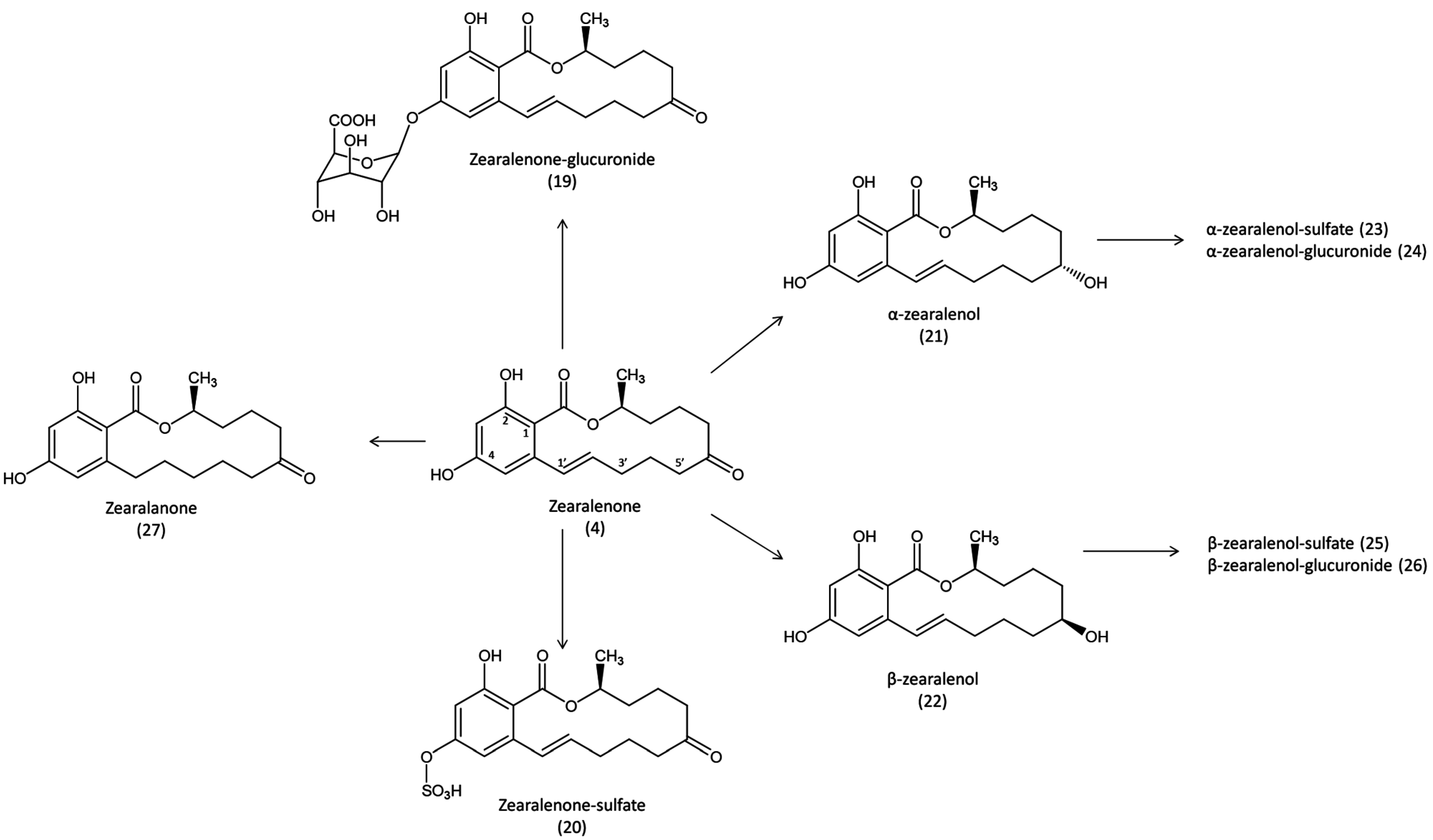 30]. Zearalenone, α- and β-zearalenol, zearalenone, and α- and β-zearalenol measured by LC/MS were below 0.1 ng/g (LOD). Zearalenone, and α- and β-zearalenol have been reported in the urine of horses fed with a diet containing 1 mg zearalenone/kg and studies conducted with microsomal and cytosolic fractions obtained from rat and pig liver have demonstrated that zearalenone and zearalenol can be glucuronided and sulfated [