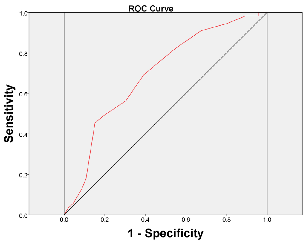 At six months after BoNT-A injection, the overall therapeutic results were reported to be failed in 55 (54.46%) and successful in 46 (45.54%) patients by GRA criteria (GRA ≥ 2 as successful) (Table 3). Univariate logistic regression analysis revealed significant relationships between the treatment outcome and baseline ICSI, ICPI, OSS, FBC, frequency, and the urodynamic parameter, first desire to void (FD) (all p < 0.05). That is, the subjects with lower ICSI, ICPI, OSS scores, lower frequency times, higher mean amount of FBC or higher mean volume of FD at baseline had a significantly greater chance to achieve a successful treatment outcome. In addition, the multivariate logistic regression model was performed based on all significant variables in the univariate analysis and showed that the baseline ICSI score (odds ratio = 0.770, 95% confidence interval = 0.601–0.989) was the only predictive factor for a treatment outcome in refractory IC/BPS patients (Table 4). We found ICSI ≥ 12 was the most predictive cutoff value for treatment failure, with a ROC area of 0.70 (sensitivity = 69.1%, specificity = 60.9%) (Figure 1).