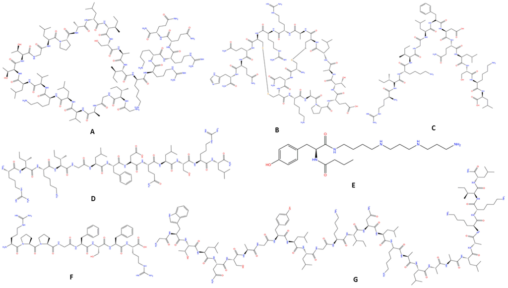 - Souza, B.M.; Cabrera, M.P.S.; Neto, J.R.; Palma, M.S. Investigating the effect of different positioning of lysine residues along the peptide chain of mastoparans for their secondary structures and biological activities. Amino Acids 2011. [Google Scholar] [CrossRef]