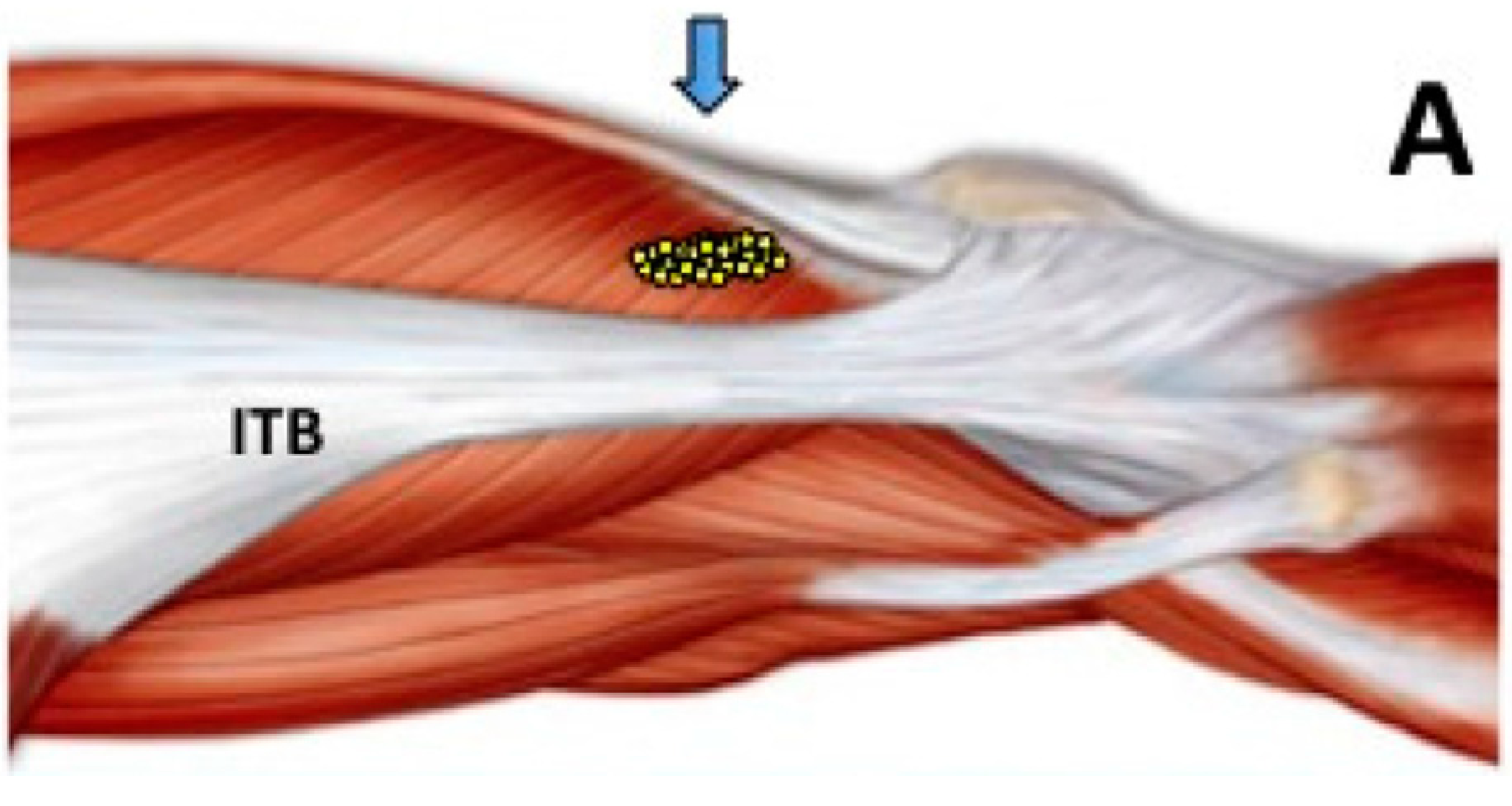 In an initial open label pilot study [43] eight female subjects with chronic AKP (mean symptom duration 5 years, range 1–19 years), who had failed conservative management, were injected with BoNT-A (500 U Dysport®; Ipsen, Paris, France) to VL muscle and underwent a twelve week individualized home exercise program. As illustrated in Figure 1 and Figure 2, motor points for the distal region of VL muscle are clustered immediately above the tendinous aponeurosis. Needle EMG guidance was used to ensure an intramuscular placement of the BoNT-A injectate. Special care was taken in a few cases with excessive subcutaneous fat to ensure the injectate was placed in the VL muscle. During the angled needle insertion, a second resistance from the overlying fascia of the iliotibial band (ITB) may be perceived (Figure 2). The cohort were relatively young (average age 29 years, range 16–40 years) and had been previously physically active, but were now markedly limited by their AKP. Prior to enrollment in this study, a careful clinical examination of potential subjects was undertaken to exclude those with excessive patellofemoral joint laxity or previous patellar dislocation, BMI > 30, or any contra-indications to BoNT-A injection. CT imaging was used to exclude those with marked joint degeneration. At 12 weeks post injection all subjects demonstrated improvements in extensor isometric force production at 30° flexion (p < 0.02) and on a timed stair climbing task (p < 0.002). There was also an improvement in knee pain and related symptoms, however the tool utilized (Knee Injury and Osteoarthritis Outcome scale—KOOS) was found to be relatively insensitive to change in this cohort, who subjectively reported improvements in activity limitation and sporting participation that were not captured by the KOOS. Most importantly, few adverse events were reported and these were minor (e.g., soreness around the injection site) which resolved within a few days [43].