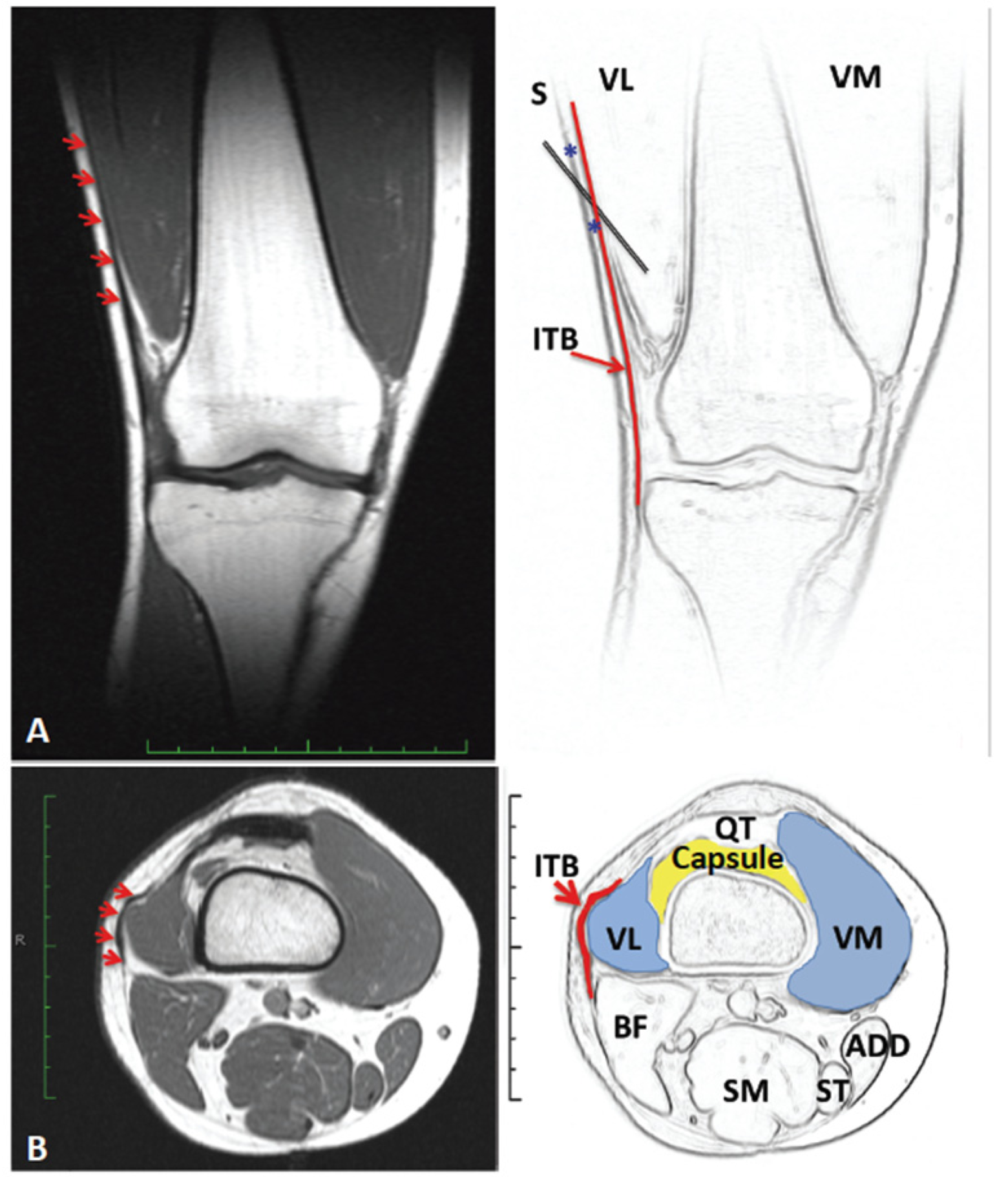 Coronal plane MRI (A) to highlight the relationship of the Iliotibial band to the Vastus Lateralis muscle (red arrows). Axial plane MRI to highlight the anatomy at the level of the superior pole of the patella (B). Note the proximity of the lateral joint capsule (supra-patella pouch) to the distal end of the VL and the overlying ITB to the VL muscle (red arrows); Legend: VM = vastus medialis, VL = Vastus lateralis, ITB = Iliotibial band, BF = Biceps femoris, SM = Semimebranosus, ST = Semitendinosus, ADD = Adductors, QT = Quadriceps tendon.
