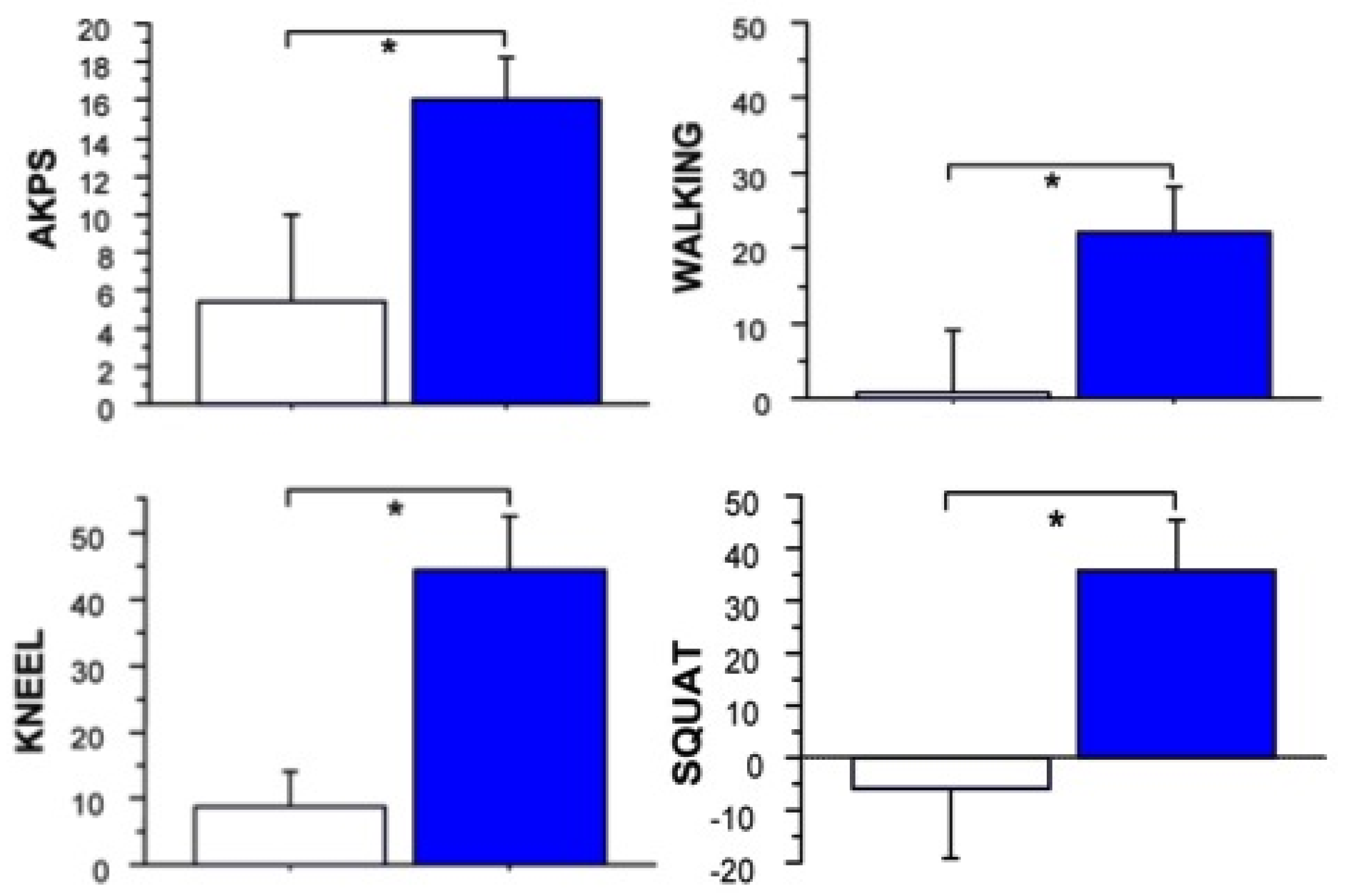 The mean (±SE) change between baseline and 12 weeks post-injection for self-reported knee-related disability and activity induced pain is depicted for BoNT-A injected (blue) versus placebo groups (white). Statistically significant differences (*) were seen between groups for pain on kneeling, walking, squatting and Anterior Knee Pain Scale (AKPS) scores. Reprinted with permission from [45]. Copyright 2011 BMJ Publishing Group Ltd.