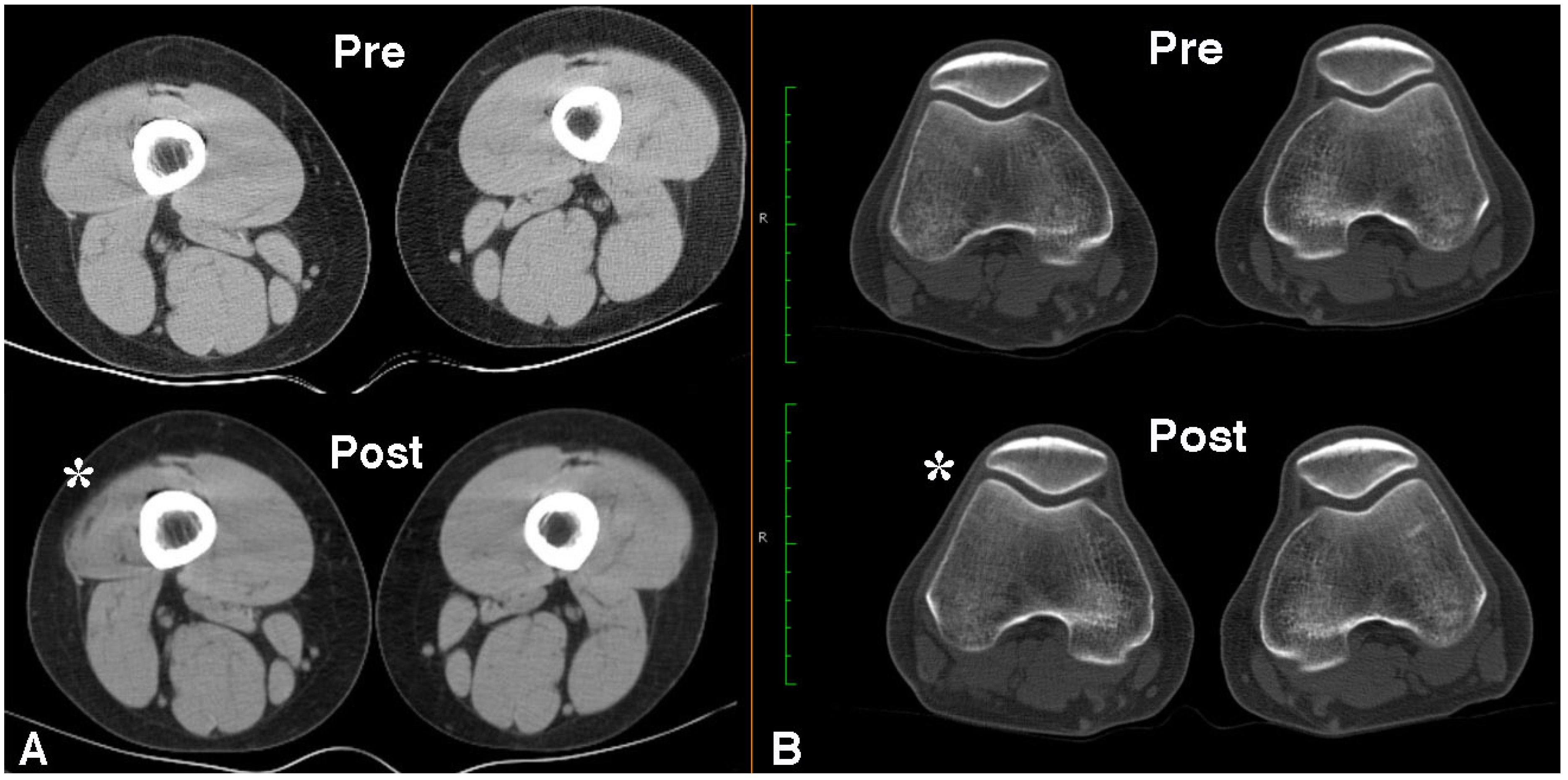 Axial CT images to highlight the anticipated focal atrophy seen in VL muscle at the 12 week follow-up review in the treated limb (*) following BoNT-A injection (A). Despite the induced atrophy, no change was recorded in force production nor congruency of the patellofemoral joint during quadriceps contraction at 30° knee flexion (B).