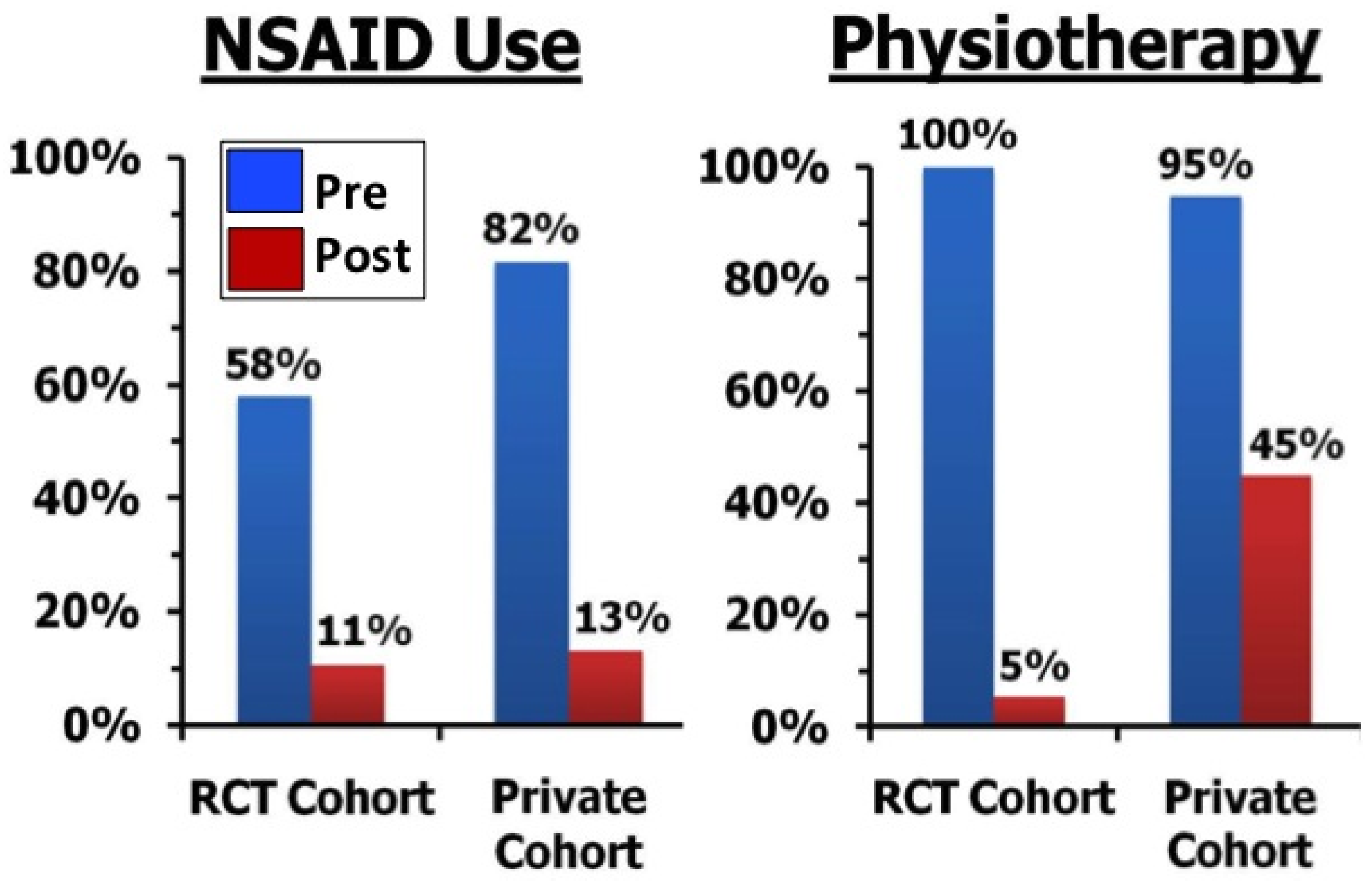 Percentage of cases from an audit survey [46] who reported using non-steroidal anti-inflammatory drugs (NSAID) and/or physiotherapy prior to and following BoNT-A injection for AKP. In both groups, reliance upon NSAID and physiotherapy was markedly diminished following BoNT-A injection for AKP.