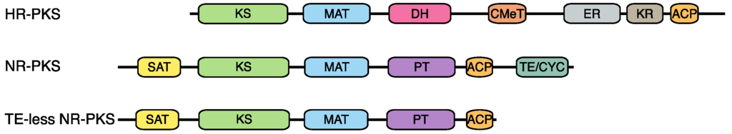 Most fungal PKSs are multi-functional enzymes known as iterative type I PKSs, where each catalytic domain is encoded in one gene, though a few fungal PKSs are of type III []. There are two main classes of type I PKS known as non-reducing (NR) and highly reducing (HR). All PKSs harbor three essential domains—the β-ketoacyl synthase (KS), malonyl-CoA:acyl carrier protein transacylase (MAT), and acyl carrier protein (ACP) domains—however, NR- and HR-PKSs vary in their catalytic domains that impact the reduction or dehydration steps of the growing carbon chain (Figure 1). The minimal architecture of HR-PKSs is typically composed of ketoreductase (KR), dehydratase (DH), and enoyl reductase (ER) domains, thereby resembling fatty acid synthases (FASs). Another key difference is the presence of a C-methyltransferase (CMeT) domain found in most HR-PKSs and only in one subset of NR-PKSs (e.g., A. nidulans AfoE, []). However, despite the presence of CMeT domains in HR-PKSs, analysis in Fusarium spp. suggests that the domain can be non-functional [].
