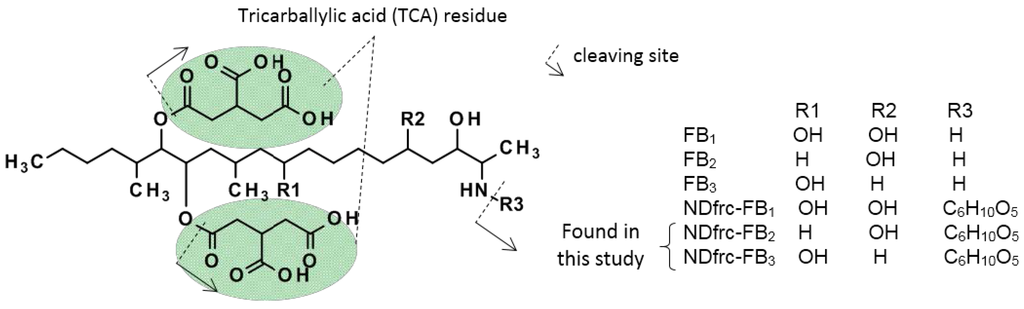 Matsuo, Y.; Takahara, K.; Sago, Y.; Kushiro, M.; Nagashima, H.; Nakagawa, H. Detection of N-(1-deoxy-d-fructos-1-yl) Fumonisins B2 and B3 in Corn by High-Resolution LC-Orbitrap MS. Toxins 2015, 7, 3700-3714. https://doi.org/10.3390/toxins7093700
