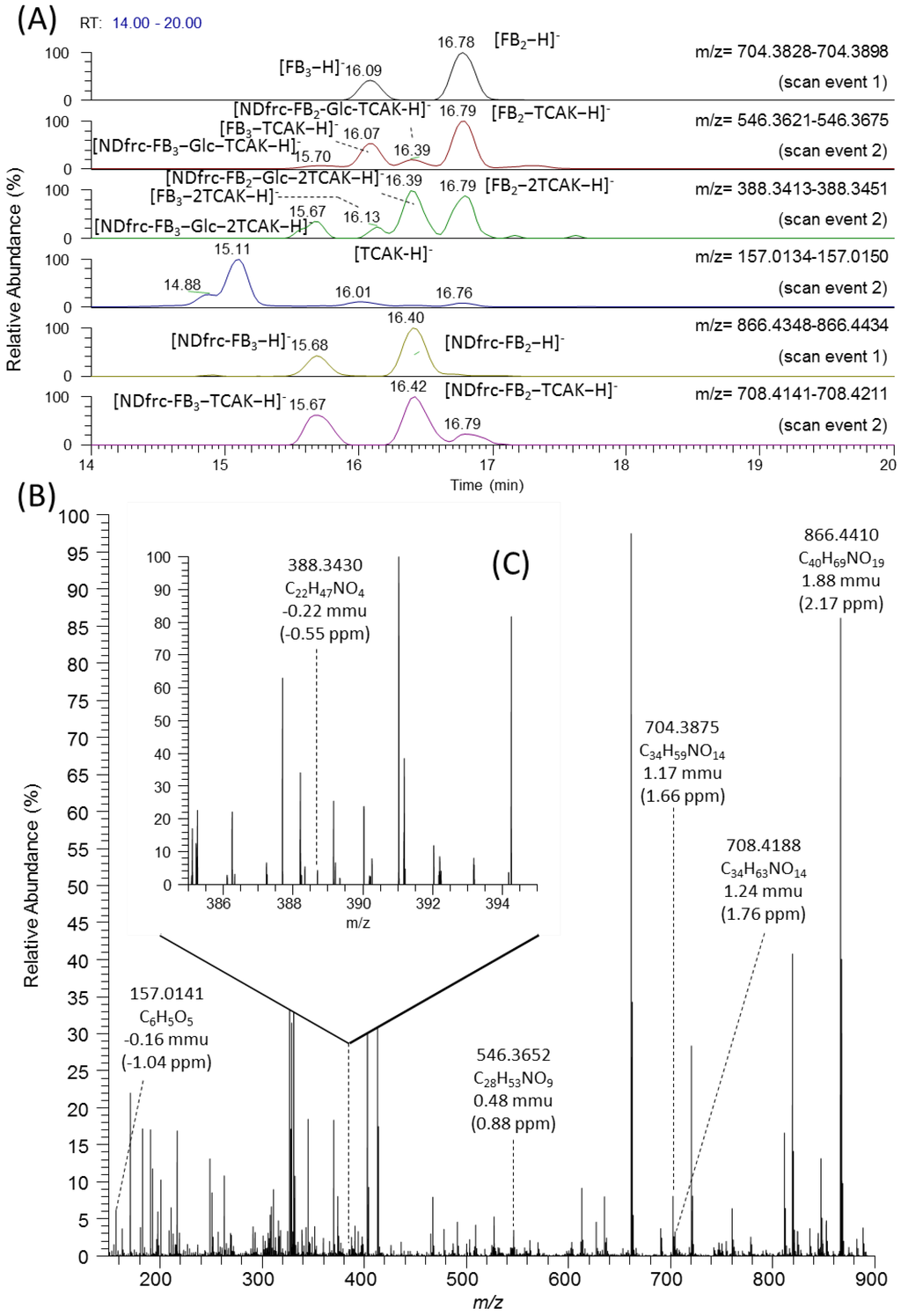| Ion | FB1 (RT: 15.09 min) | NDfrc-FB1 (RT: 14.87 min) | ||||||