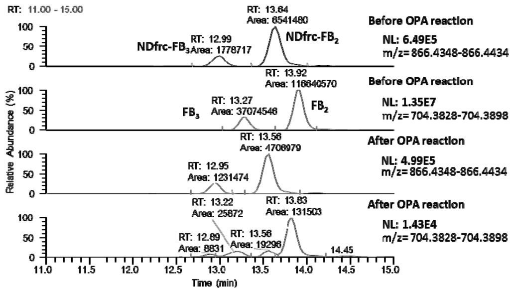2.7. Treatment of Fumonisins and FBs-Glucose Conjugate by OPA Reagent