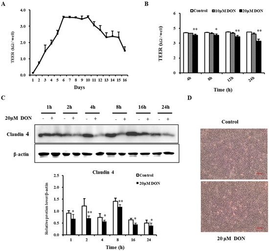 Deoxynivalenol (DON) impaired TEER (transepithelial electrical resistance) and decreased the expression of the claudin-4 protein in differentiated IPEC-J2 cells. Cultured cells reached confluence within two days, and the differentiation medium was then used (changed every other day). (A) Changes in TEER in differentiated IPEC-J2 cells were measured during the next 16 days of culture; (B) TEER of differentiated IPEC-J2 cells on day 7 after a 4 h, 8 h, 12 h, and 24 h exposure to 10 μM and 20 μM DON; (C) Expression of claudin-4 in the differentiated IPEC-J2 cells on day 7 after 1 h, 2 h, 4 h, 8 h, 16 h, and 24 h treatment with 20 μM DON, with β-actin as loading control. Results were obtained using six replicates (n = 6). Data are presented as means ± SEM. *, p ≤ 0.05; **, p ≤ 0.01; (D) Cell morphology after 20 μM DON treatment for 24 h. Scale bars in all pictures are 50 μm. Magnification: 100×.