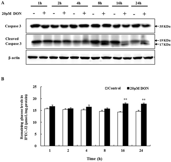 The effects of DON exposure on caspase-3 activity and glucose consumption in differentiated IPEC-J2 cells. (A) Caspase-3 and the cleaved caspase-3 fragment from differentiated IPEC-J2 cells on day 7, after 1 h, 2 h, 4 h, 8 h, 16 h, and 24 h treatment with 20 µM DON analyzed with Western blotting, with β-actin as loading control; (B) Remaining glucose levels were measured after DON exposure (as described in A) and normalized using total protein content. Six replicates were used (n = 6), and data are presented as means ± SEM. **, p ≤ 0.01.