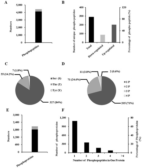 Characterization of phosphorylated peptides, phosphorylation sites, and phosphoproteins in differentiated IPEC-J2 cells after DON exposure. (A) The number of differentially regulated phosphorylated peptides (gray) (289) among all the peptides (4134) identified (gray + black), as determined by a fold-change > ±1.2; (B) Analysis of the 289 differentially phosphorylated peptides after DON exposure; (C) Overall distribution of the Ser, Thr, and Tyr phosphorylation sites; (D) Distribution of singly, doubly, triply, and quadruply phosphorylated peptides; (E) The number of differentially regulated proteins (gray) (255) among all the phosphorylated proteins (1821) identified (gray + black), as determined by a fold-change > ±1.2; (F) Numbers and percentages are based on different numbers of phosphopeptides identified.