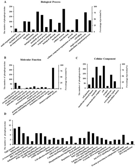 Gene Ontology (GO) and Kyoto Encyclopedia of Genes and Genomes (KEGG) pathway enrichment analysis of differentially regulated phosphoproteins after DON exposure in differentiated IPEC-J2 cells. Fold-change > ±1.2. Data are presented according to the (A) biological process; (B) molecular function; and (C) cellular component (or sub-cellular localization) and shown as a percentage of the total number of differentially identified phosphoproteins (255) that fall within each category; (D) Data are presented according to the differentially identified phosphoproteins (255) involved in the relevant signaling pathways, which were classified into 29 different categories depending on their predicted functions.