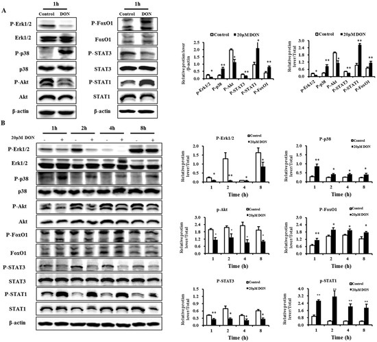 Activities of Erk1/2, p38, Akt, FoxO1, STAT3, and STAT1 in differentiated IPEC-J2 cells exposed to DON. (A) Activities of Erk1/2, p38, Akt, FoxO1, STAT3, and STAT1 in the differentiated IPEC-J2 cells (on day 7) treated for 1 h with 20 μM DON; (B) Activities of Erk1/2, p38, Akt, FoxO1, STAT3, and STAT1 in differentiated IPEC-J2 cells (day 7) treated for 1 h, 2 h, 4 h, and 8 h with 20 μM DON. After the proteins were isolated, the total and phosphorylation-specific antibody reactions were assessed using Western blotting, with total protein or β-actin as a loading control. All results were obtained using six replicates (n = 6), and data are presented as means ± SEM (standard error of the mean). *, p ≤ 0.05; **, p ≤ 0.01.