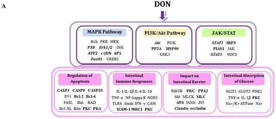 Summary of potential signaling pathways and biological processes involved in the DON-induced intestinal toxicity in differentiated IPEC-J2 cells. (A) Signaling pathways affected included MAPKs (blue), PI3K/Akt (orange), and JAK/STAT (green); The key biological processes included regulation of (B) apoptosis, intestinal immune responses; (C) intestinal barrier, and intestinal absorption of glucose. The bold font indicates the novel mediators identified in this study, the bold and italics denote the mediators verified by Western blot, and normal font denotes the previously known mediators that are not identified here.